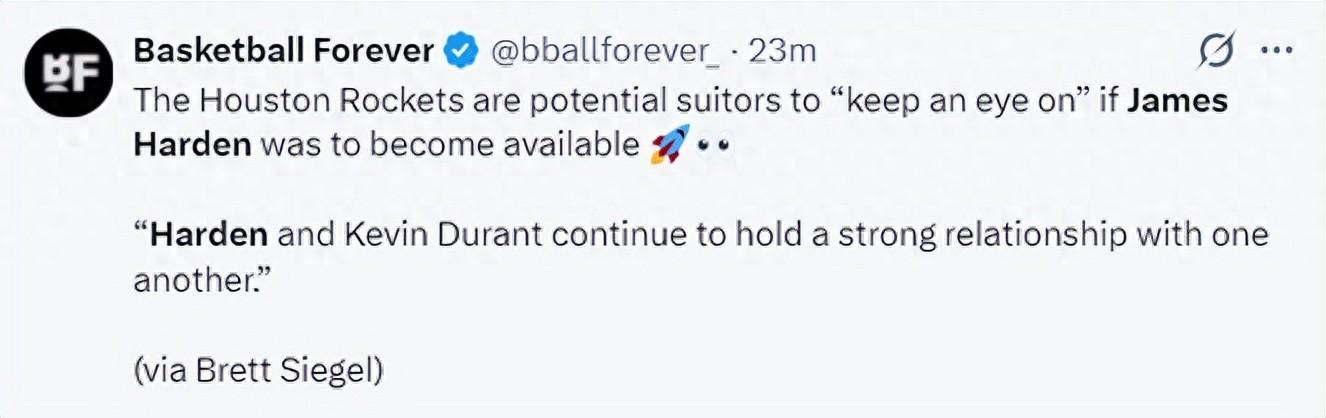 北京時間12月4日,NBA記者Brett Siegel報道,假如詹姆斯-哈登能被交易,那麼休斯頓火箭隊會是對他有興趣的球隊之一,因爲哈登與杜蘭特的關係十分牢固,不過火箭的薪資情況不太好,他們想要得到一位全明星後衛並不容易。