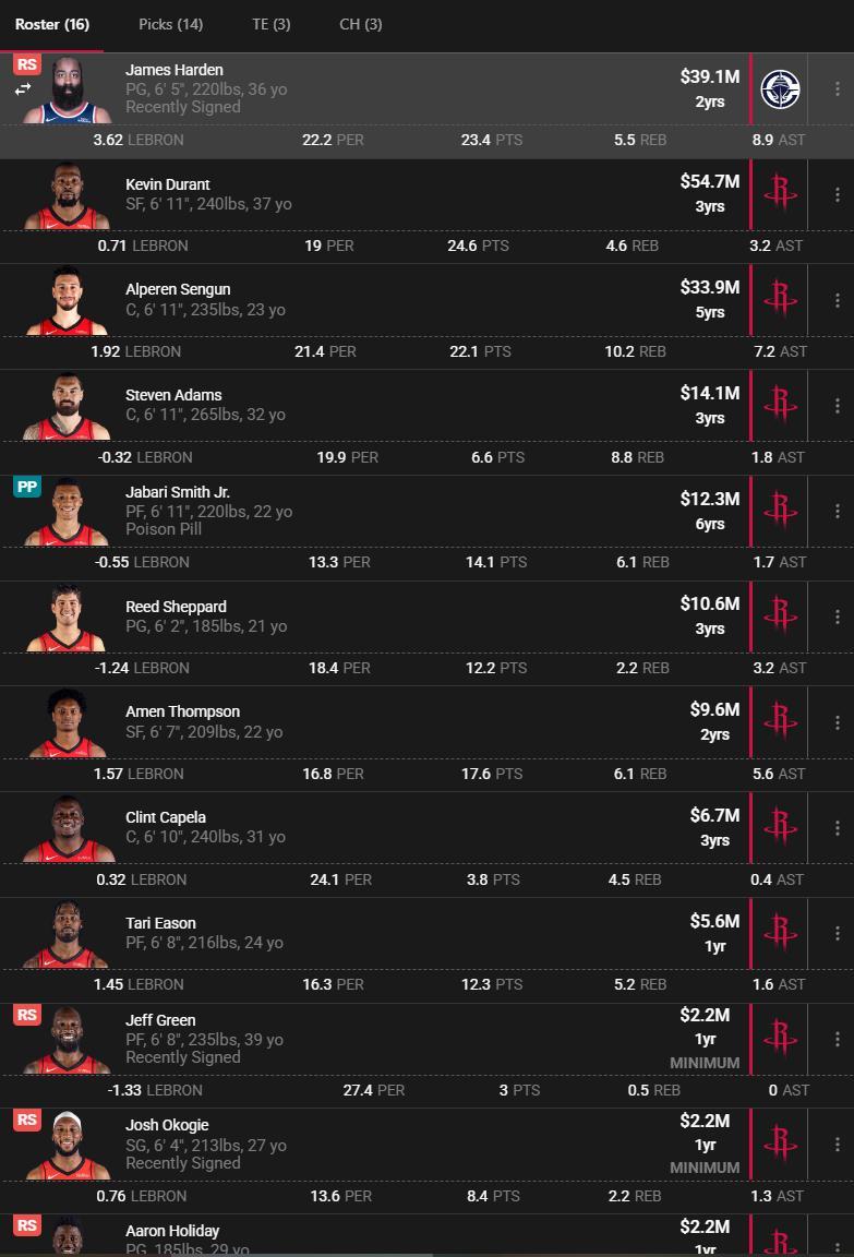 杜蘭特、哈登、歐文三人曾在籃網隊一同打球,但杜蘭特、歐文連番遭遇傷病,哈登一人扛着球隊走了很久,最終哈登被累到腹溝股拉傷,36歲的哈登依舊是一位場均27+8+6的全明星後衛,他是火箭目前最需要的一號位。
