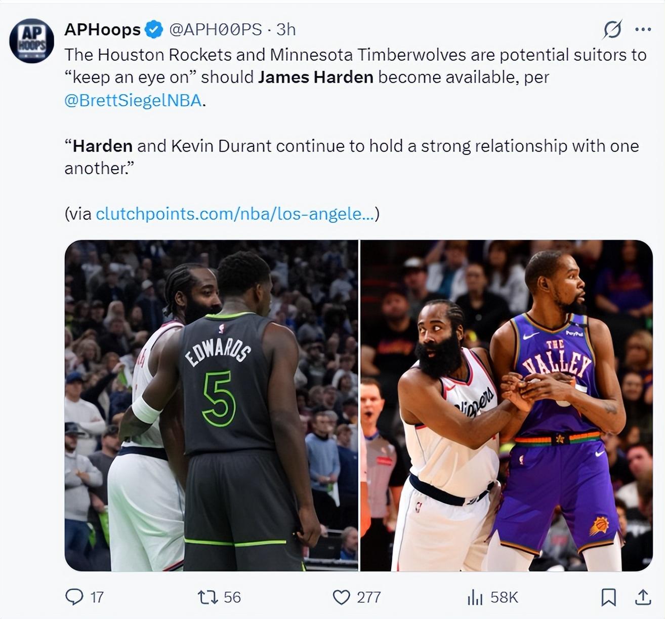 除了火箭隊之外,明尼蘇達森林狼也是密切關注哈登動向的球隊,他們希望找到一位控球后衛來減壓愛德華茲,但森林狼能拿出的籌碼肯定不如火箭,這一點火箭是佔據優勢的。