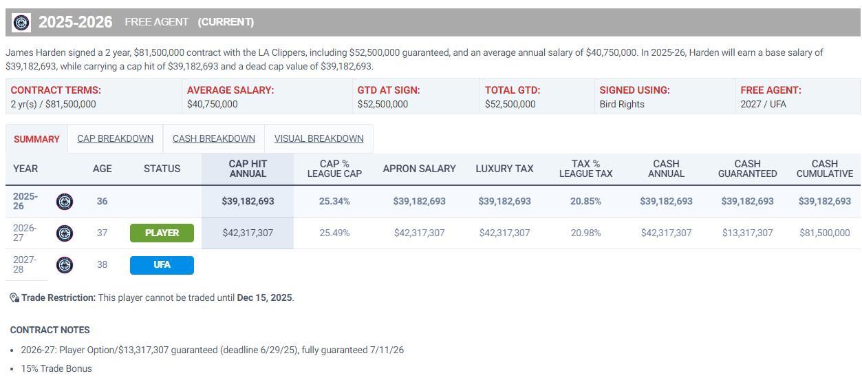 哈登本賽季的薪水爲3918萬,這份薪水如果火箭要單獨交易他,配平難度其實較大,就算出範弗利特的2500萬,都還有一千多萬的缺口。
