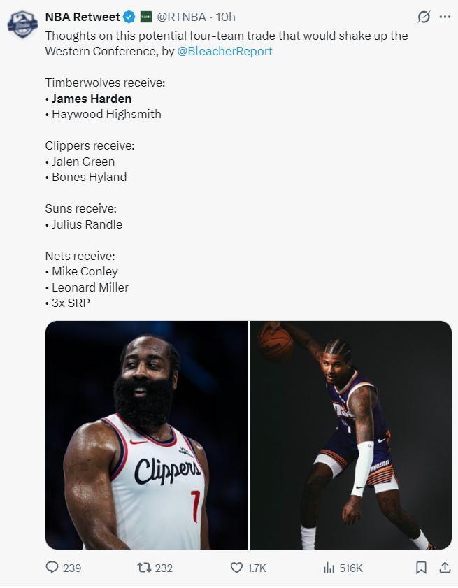 《露天看臺》十小時前就爲森林狼交易得到哈登進行了模擬,森林狼、快船、太陽、籃網四方大交易,森林狼得到哈登、海史密斯,快船得到杰倫-格林、海蘭;太陽得到蘭德爾,籃網得到康利、米勒、3個選秀權。