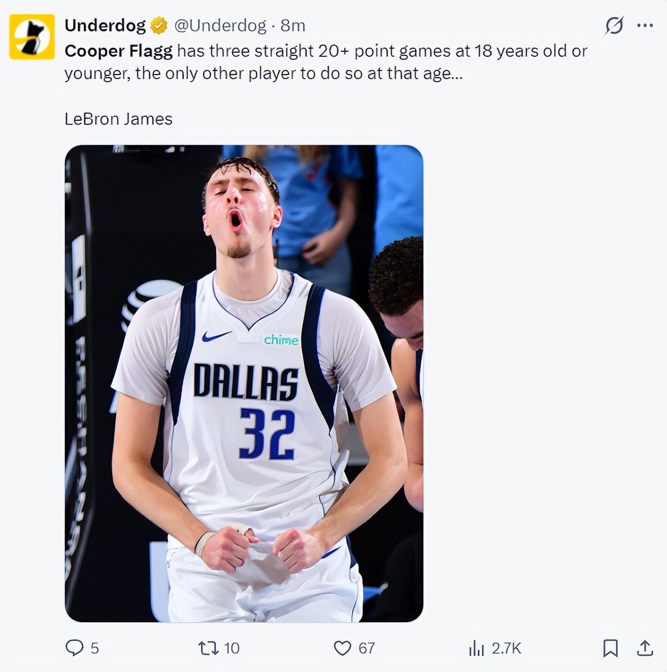 4.18歲時弗拉格已經拿到8次20+,僅次於詹姆斯的14次;