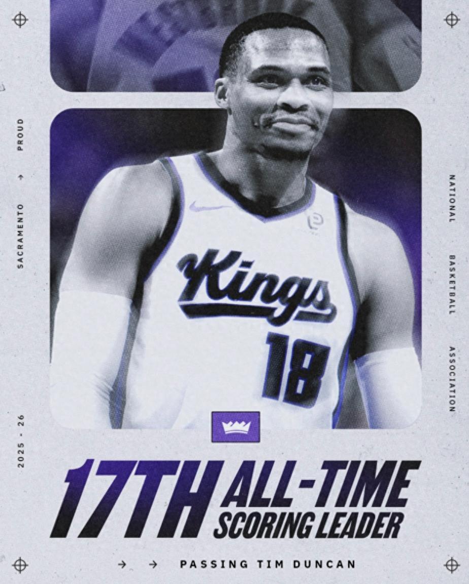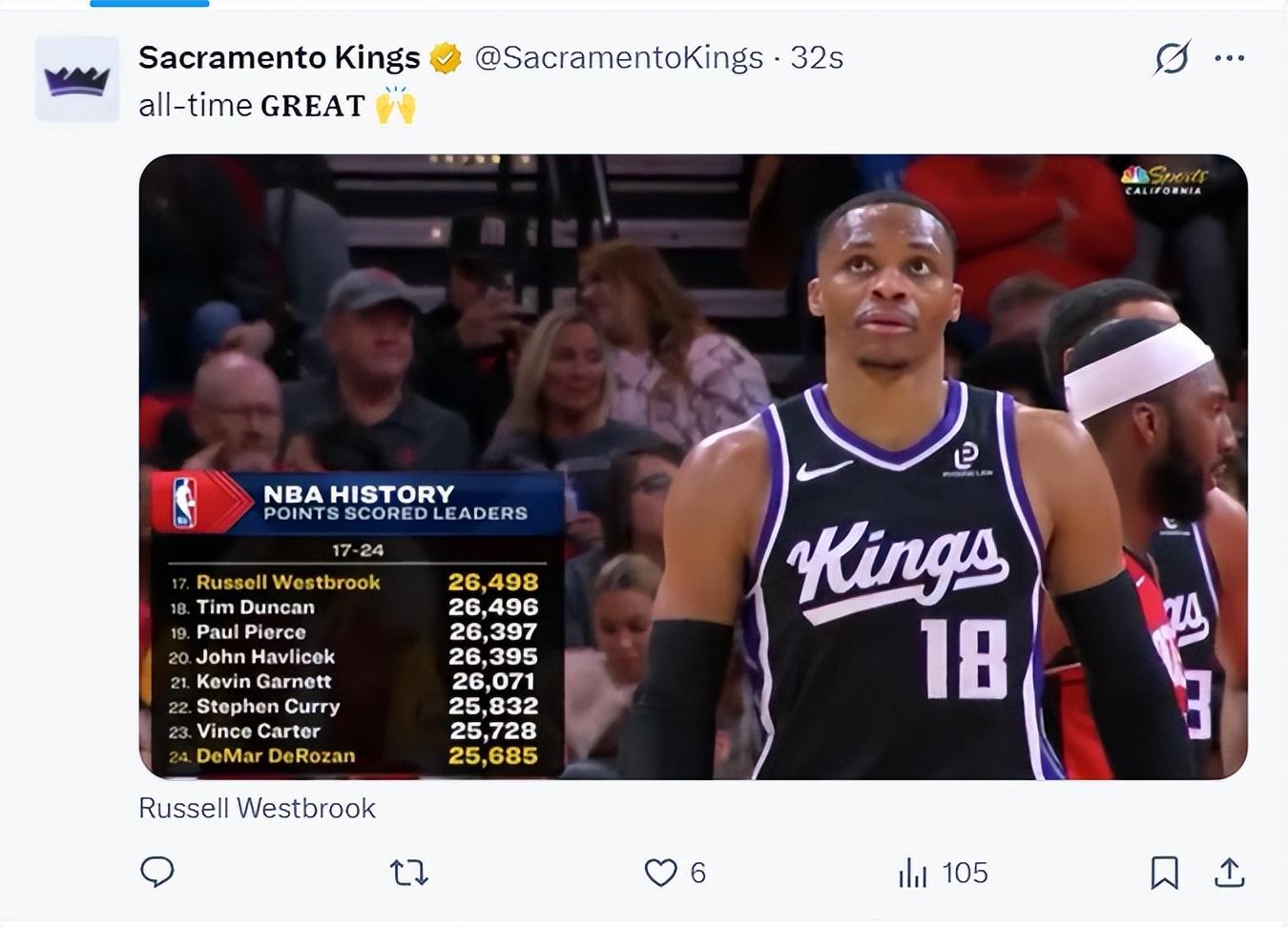 第二節還剩7分03秒,威少完成一個運動戰進球后他的生涯總得分超過名宿蒂姆-鄧肯(26496分)升至NBA歷史得分榜第17位,德羅贊目前排在第24位,37歲的威少再度迎來里程碑。