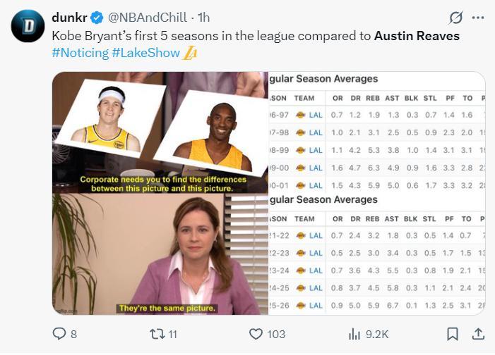 美媒曬出了裏夫斯與科比生涯前五個賽季的數據變化,都是從場均7分一路攀升,生涯第五個賽季科比場均28.5分,裏夫斯生涯第五個賽季28.1分相差無幾。