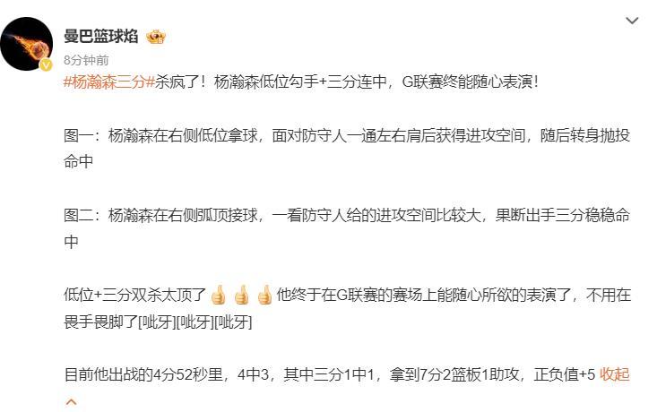 博主:楊瀚森在G聯賽可以隨心表演,在G聯賽大殺四方。