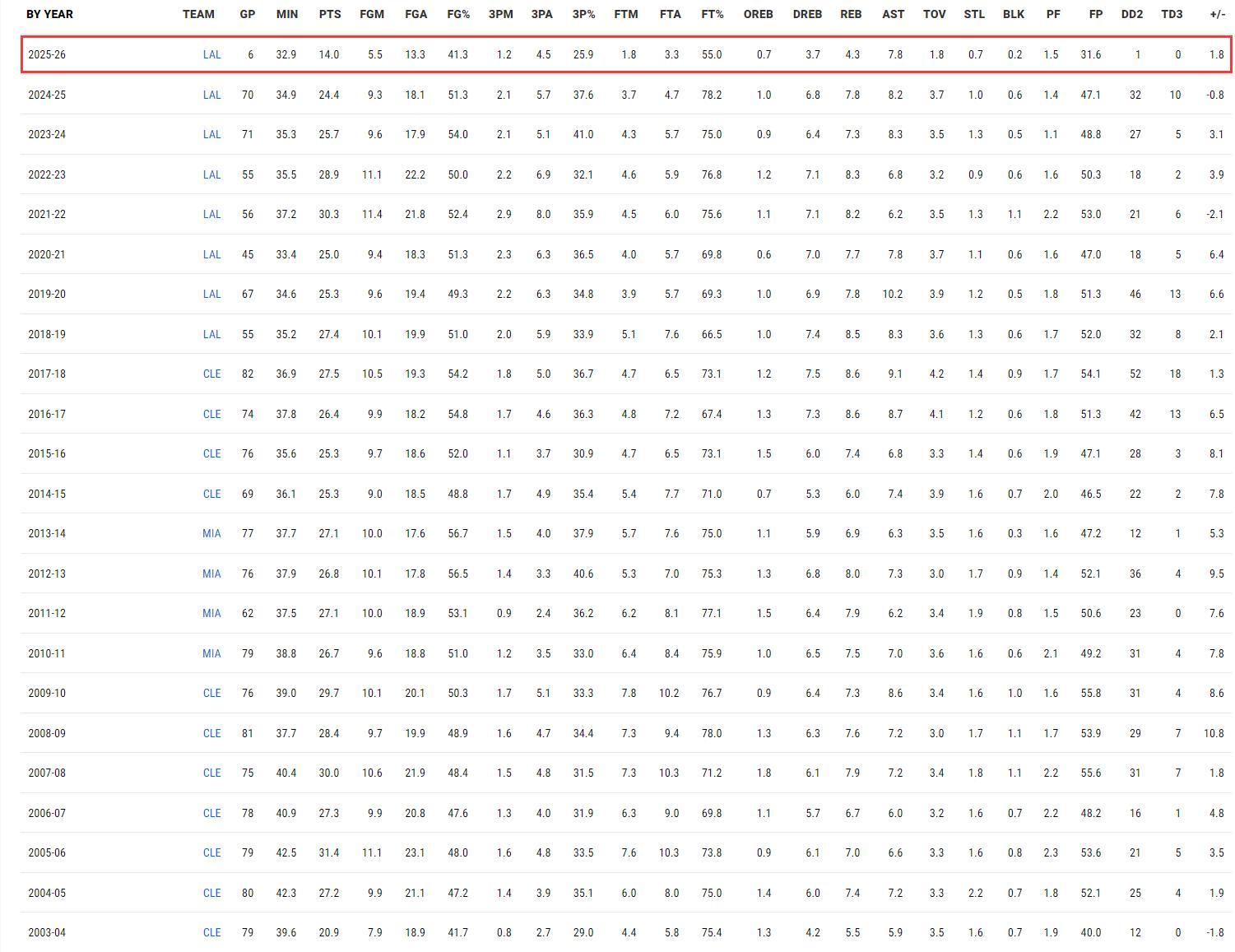 本賽季勒布朗出戰6場比賽,場均32.9分鐘,拿到14分4.3籃板7.8助攻0.7搶斷0.2蓋帽,命中率41.3%,三分命中率25.9%,罰球命中率55%。