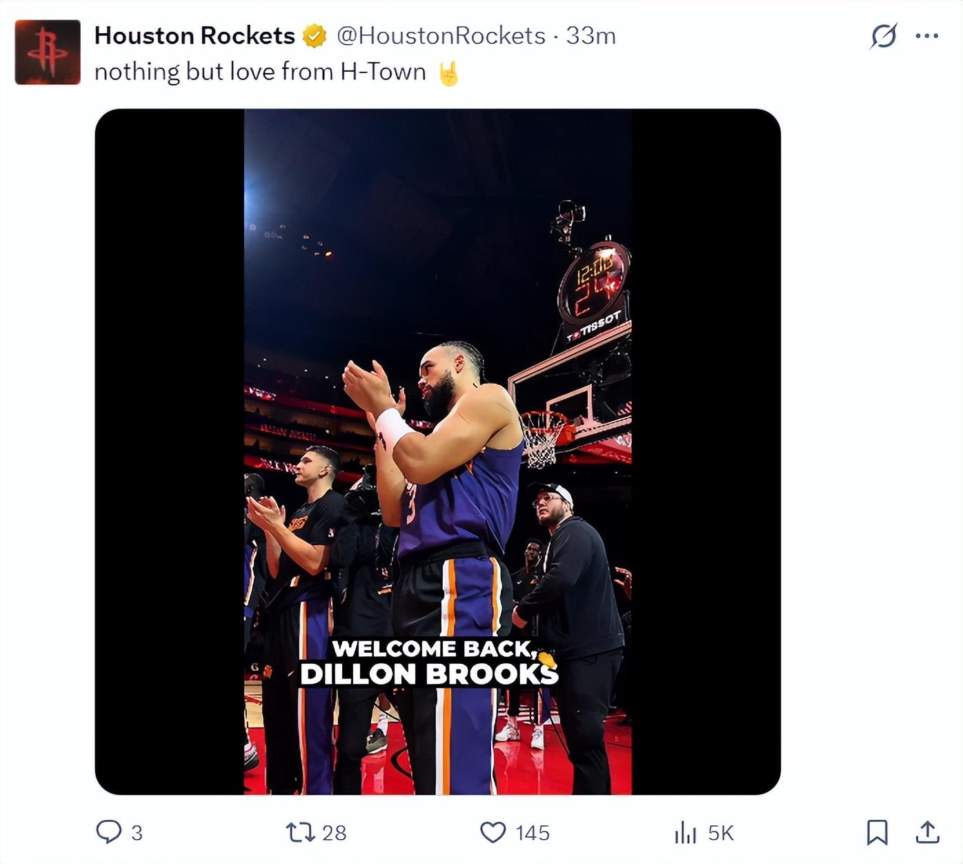 隨後火箭隊主場也播放了致敬狄龍的視頻,感謝了狄龍在休斯頓的貢獻,這兩人就是火箭今夏交易得到凱文-杜蘭特最重要的籌碼。