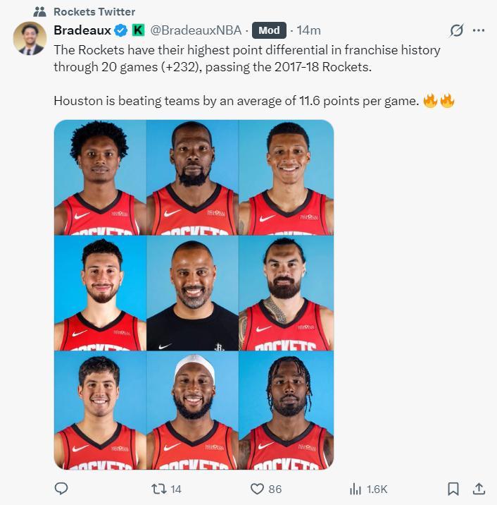 火箭記者Bradeaux寫道:截止本賽季的前20場比賽,火箭淨勝分+232隊史最多超過了2017-18賽季,場均淨勝對手11.6分。