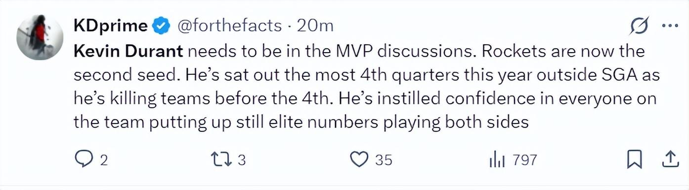 美媒:杜蘭特理應進入MVP討論,火箭已經升至西部第二,杜蘭特本賽季總是在第四節擊敗對手,他在隊內讓所有人充滿信心,無論是進攻還是防守他都可以交出完美的數據。
