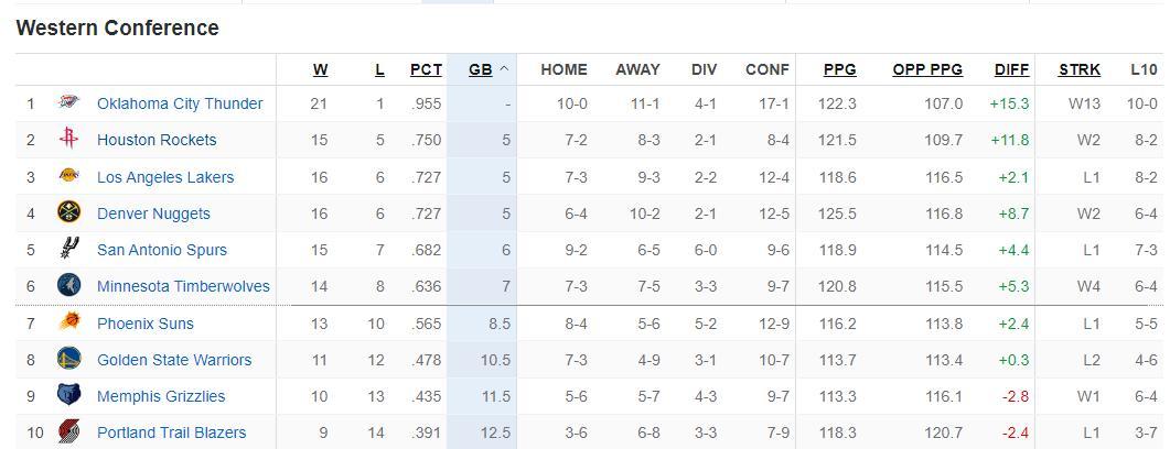 隨着馬刺不敵騎士、湖人不敵綠凱,火箭擊敗太陽後直接升至西部第二的位置,掘金逆轉老鷹進入西部前四。