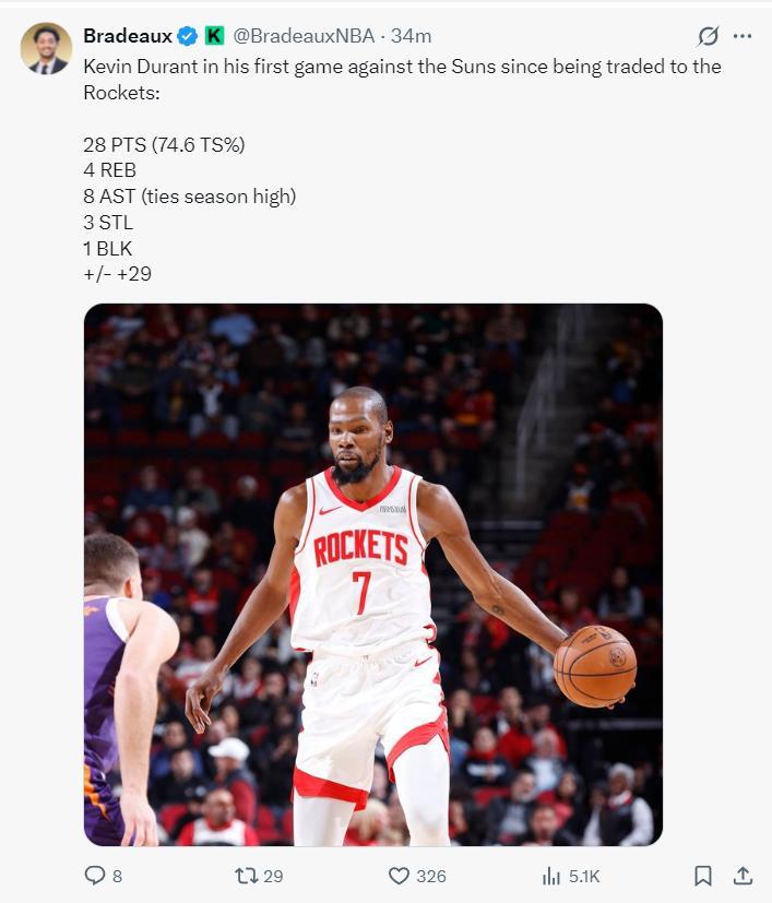 這場比賽杜蘭特面對舊主太陽,這是他本賽季首次打舊主,三節打卡下班32分鐘,17中11,三分2中2,罰球4中4,拿到28分8助攻4籃板3搶斷1蓋帽,命中率64.7%,三分命中率100%,正負值+29。