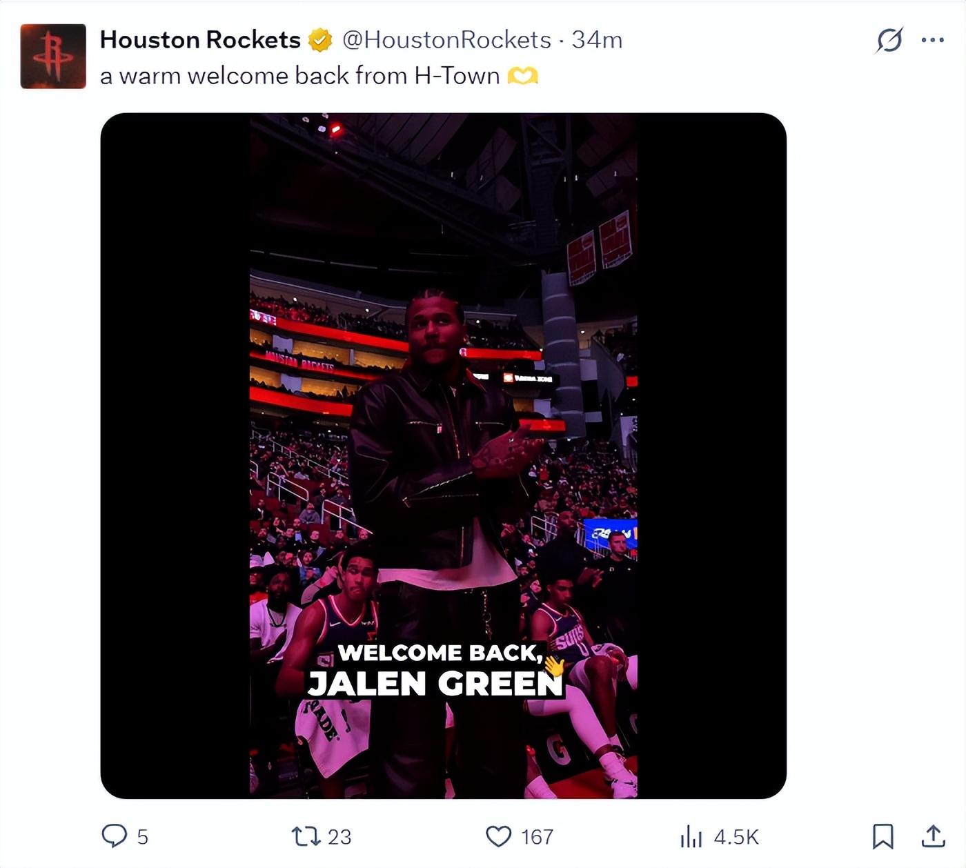 這場比賽之前火箭隊官方曬出了致敬杰倫-格林的視頻,感謝了格林在休斯頓的貢獻。
