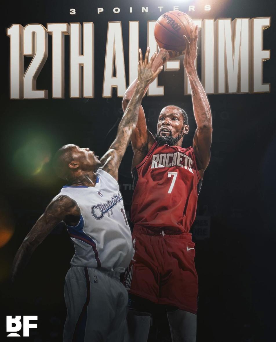 杜蘭特第二個里程碑,三分球命中數超越賈馬爾-克勞福德升至歷史第 12 位。