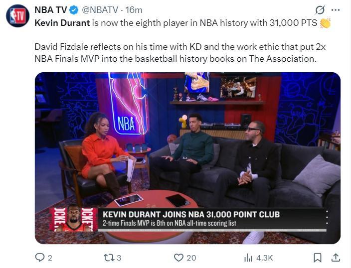 首節杜蘭特5中1拿到4分,也完成了31000分大關,在NBA TV的丹尼-格林、大衛-菲茲戴爾都回顧了杜蘭特這樣1MVP+2FPMV超巨在籃球這個項目上的成就,他們都認爲KD已經青史留名。
