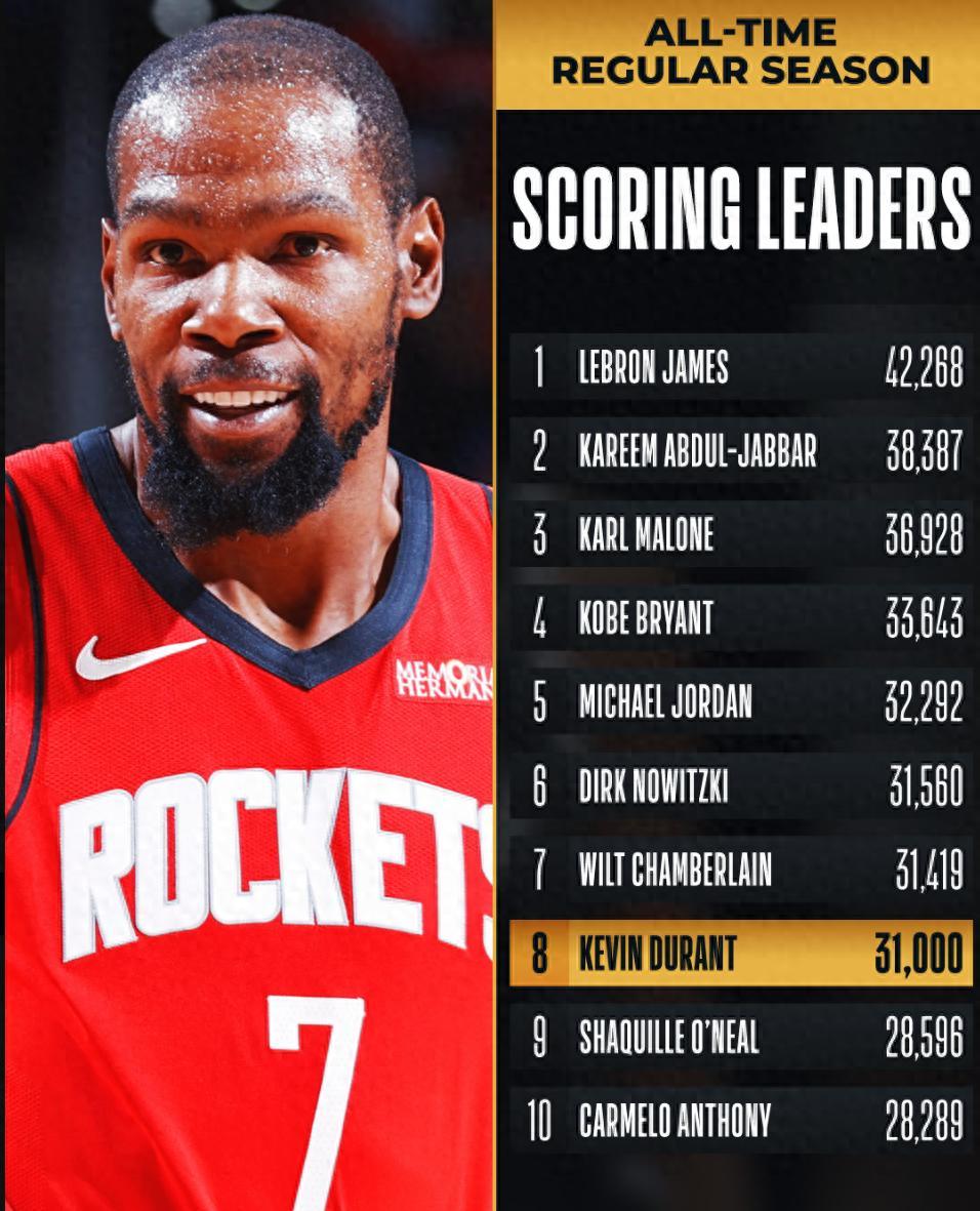 北京時間12月6日,火箭逆轉太陽拿到二連勝。這場比賽是杜蘭特的里程碑之夜,他的歷史總得分超31000分大關,成爲歷史第八位拿到31000+的球員,也是現役第二位31000分先生,除此之外他的三分球命中數超過克六升至歷史第12位,杜蘭特拿到31000分用1141場,追平詹姆斯並列歷史第三快。