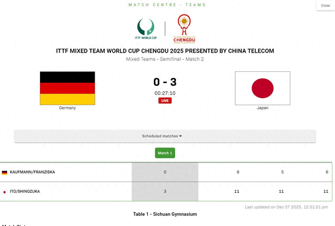 北京時間12月7日,成都混合團體世界盃半決賽,日本隊VS德國隊,第一盤弗朗西斯卡/考夫蔓VS篠塚大登/伊藤美誠,最終伊藤美誠/篠塚大登3-0擊敗弗朗西斯卡/考夫蔓爲日乒拿到寶貴的三分。