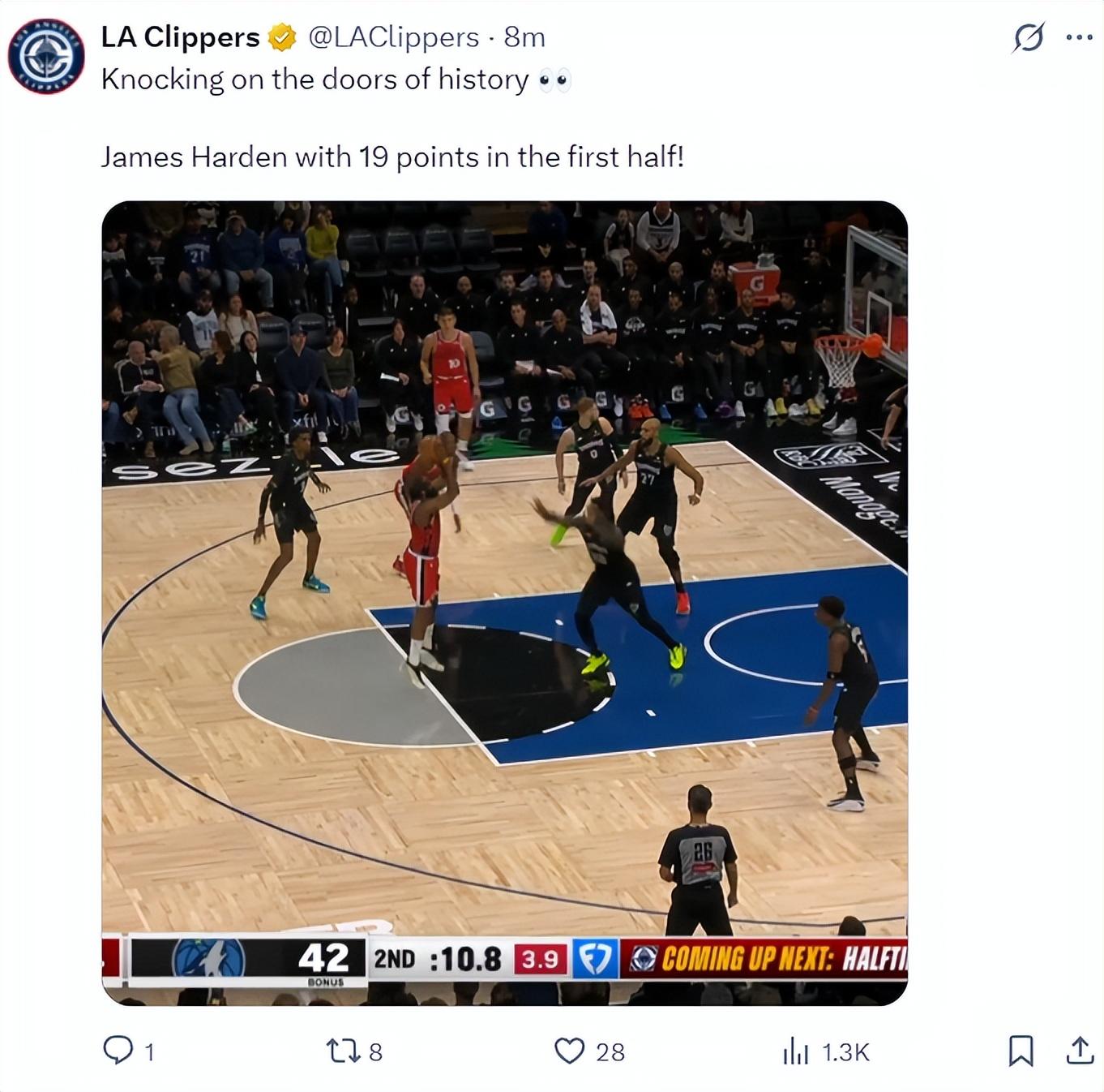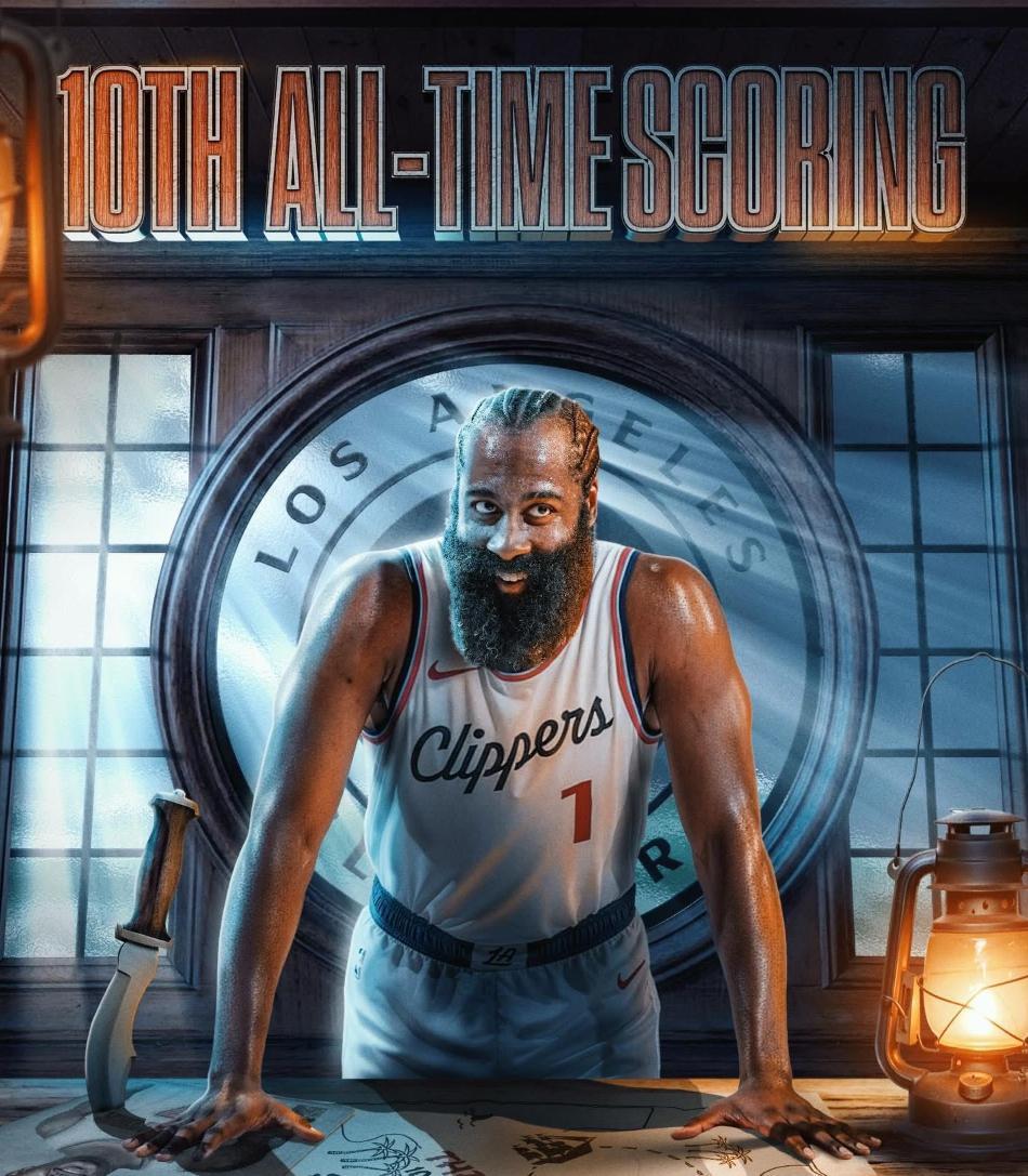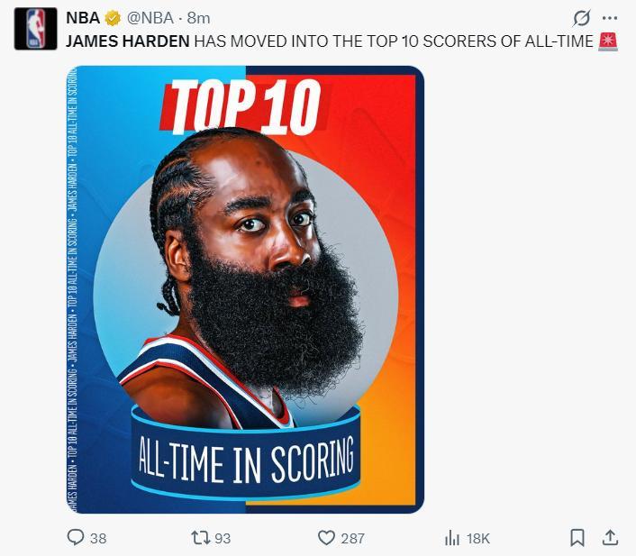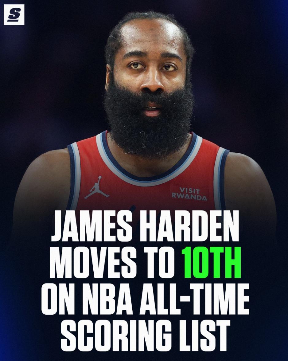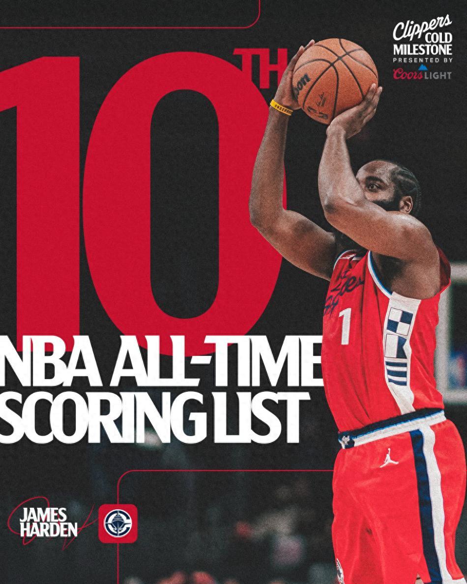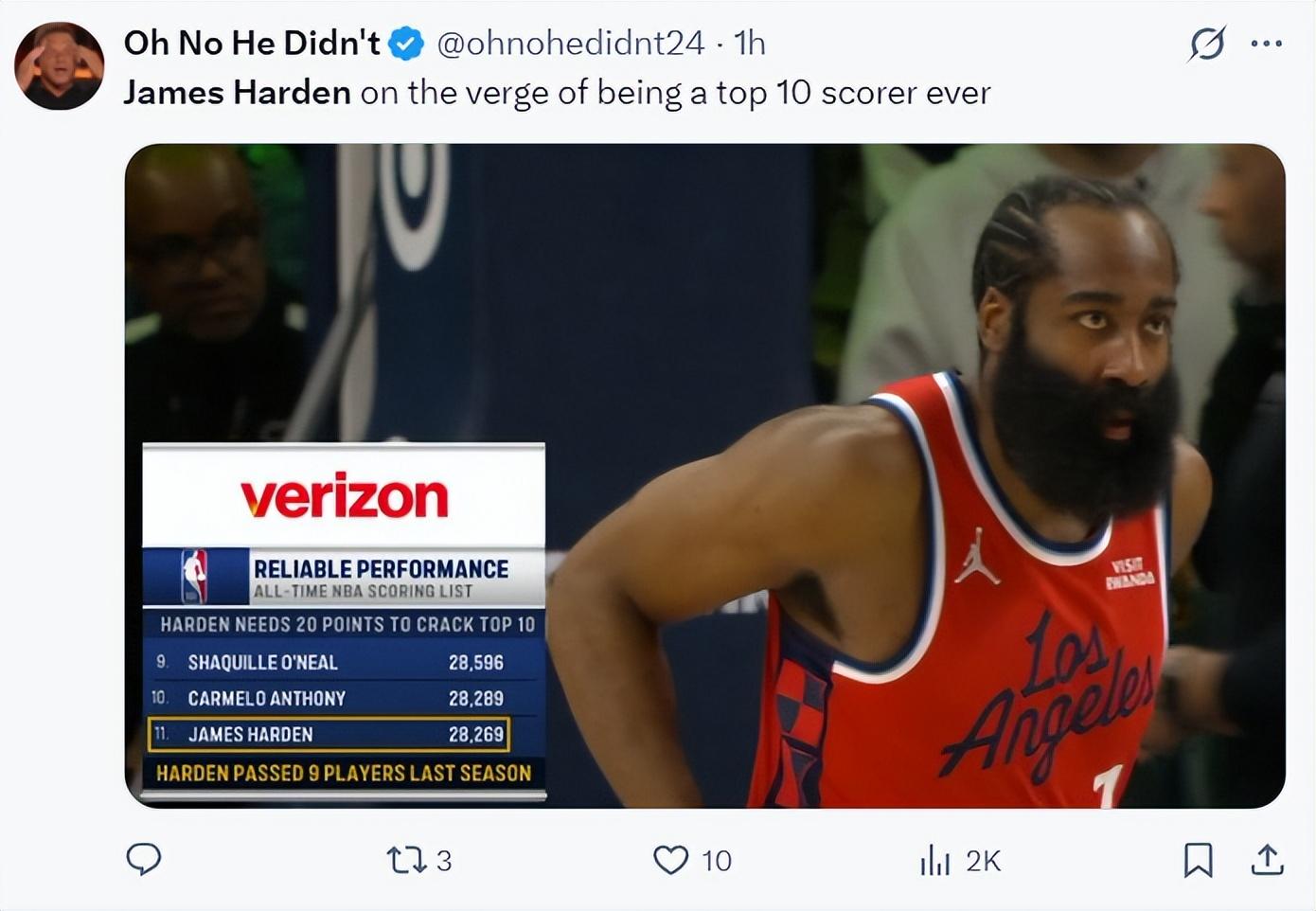 第三節哈登通過兩個罰球超越安東尼正式進入NBA歷史得分榜前十。NBA官方發推爲哈登慶祝,第三節哈登5中1+三分2中0+罰球5中5,拿到7分2籃板2助攻1蓋帽,三節打完已經拿到26分4助攻真的不算差。