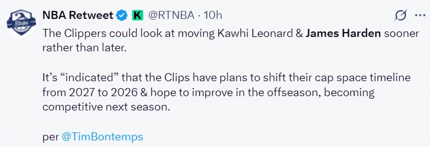另一條消息來自NBA記者Tim Bontemps:快船可能會考慮交易倫納德與哈登,而不是拖到之後,有跡象表明,快船計劃將薪資空間的清理從2027年提前到2026年,並在明夏完成補強,以確保下賽季有競爭力。