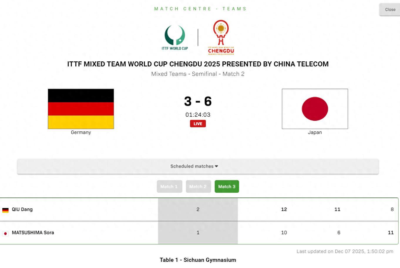 第三局開場邱丹3-3松島輝空,兩人繼續4-4,松島輝空6-4終於反超,邱黨追到6-7,松島輝空9-6拉開到3分,德國隊叫了暫停。最終松島輝空11-8拿下一局,但這場比賽還是29歲的邱黨取勝。