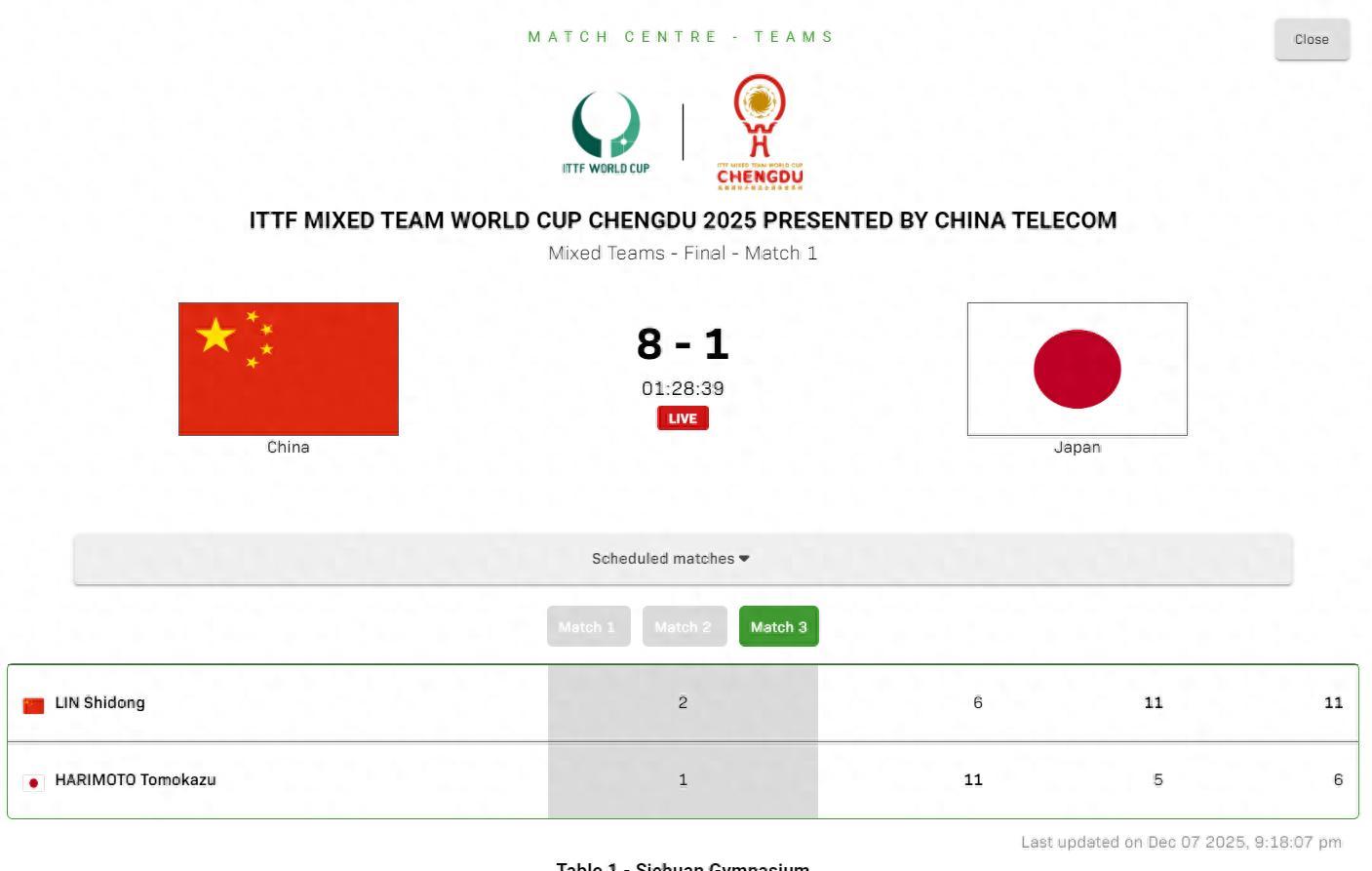 北京時間12月7日,成都混合團體世界盃決賽,中國隊8-1日本隊完成三連冠。第三盤:林詩棟VS張本智和,林詩棟世界男單第二,張本智和世界男單第五,張本22歲,石頭20歲,此役算同齡最頂尖的男單對決,最終林詩棟2-1逆轉張本智和,國乒8-1僅用三盤拿下勝利。