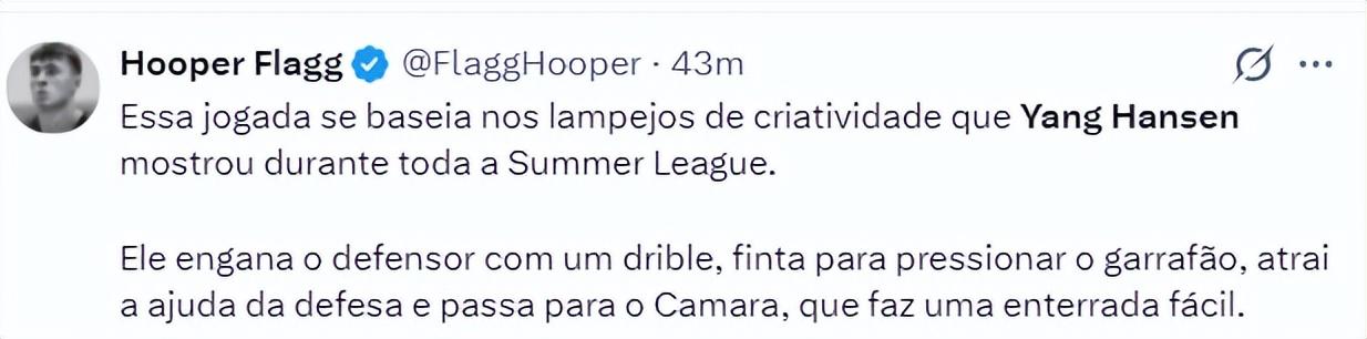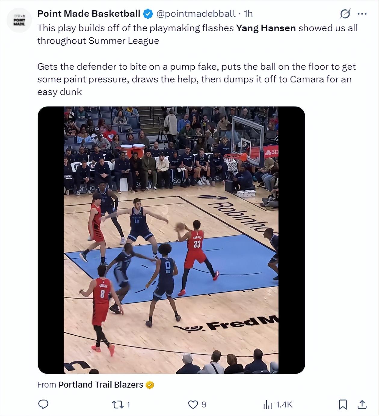 美媒還是盛讚了楊瀚森的表現:夏季聯賽楊瀚森就展現了出色的進攻組織能力,他可以利用假動作晃起對手的重心,衝入禁區前吸引協防把球傳給隊友。