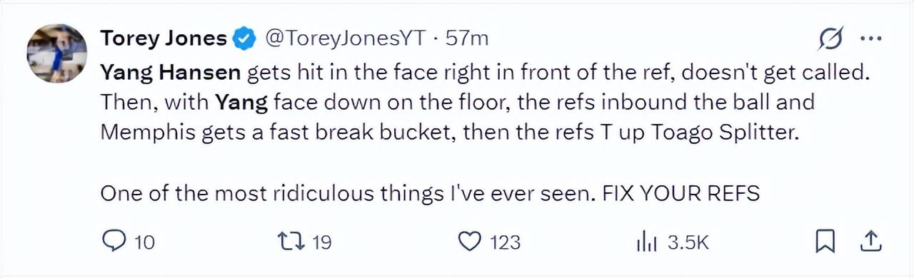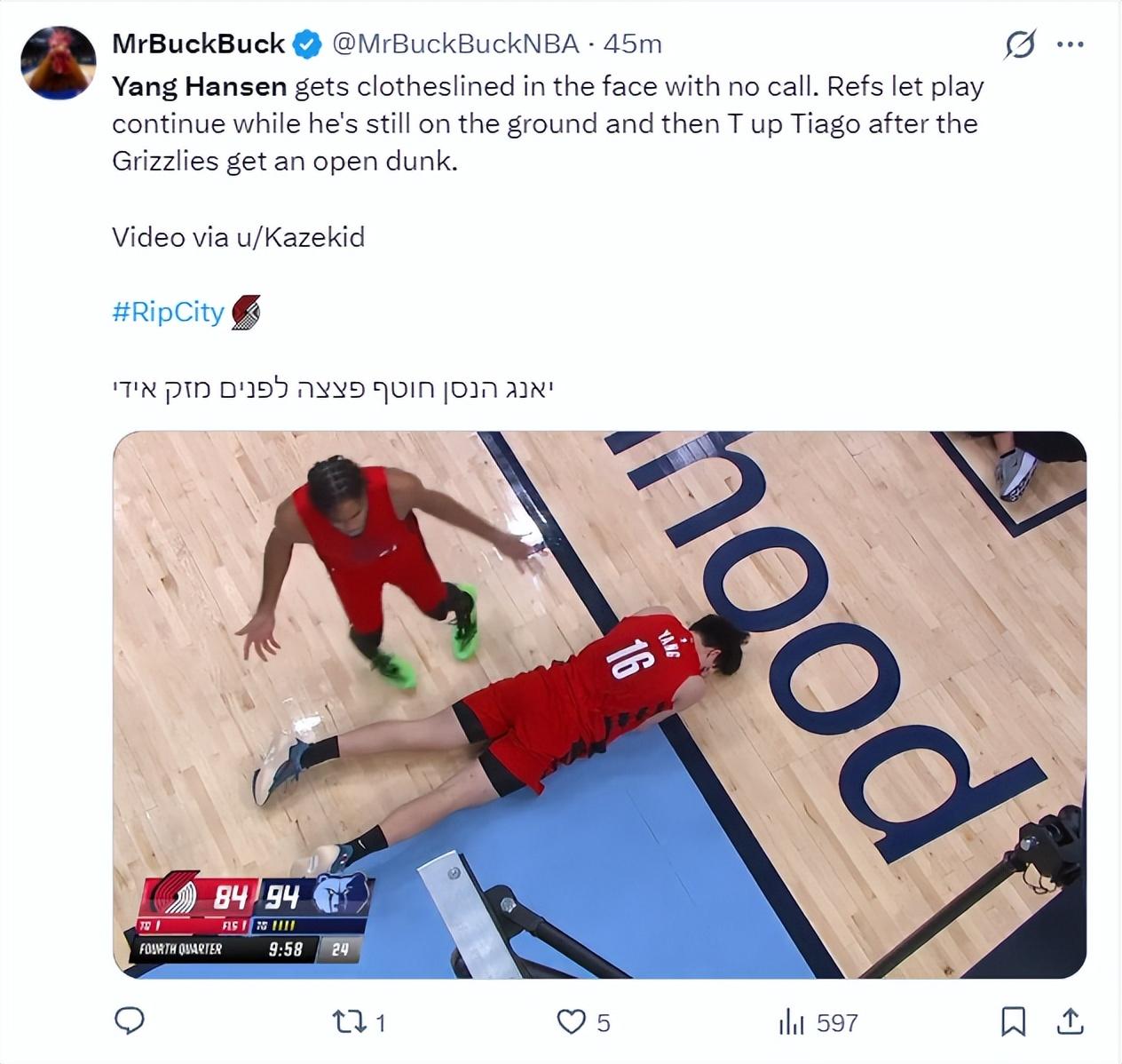 開拓者媒體:楊瀚森在毫無防備的情況下被打到面部,裁判們對此無動於衷還讓比賽繼續進行,灰熊完成了一次無人防守的扣籃才吹停了比賽。