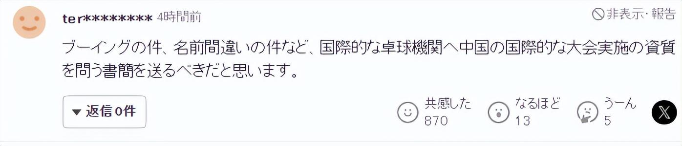 在混團決賽結束後,日本球迷引發了熱議,有日本球迷寫道:我認爲國際大賽上唸錯名字、巨大噓聲都應該寫信詢問國際乒聯,成都是否有繼續舉辦國際大賽的資格。