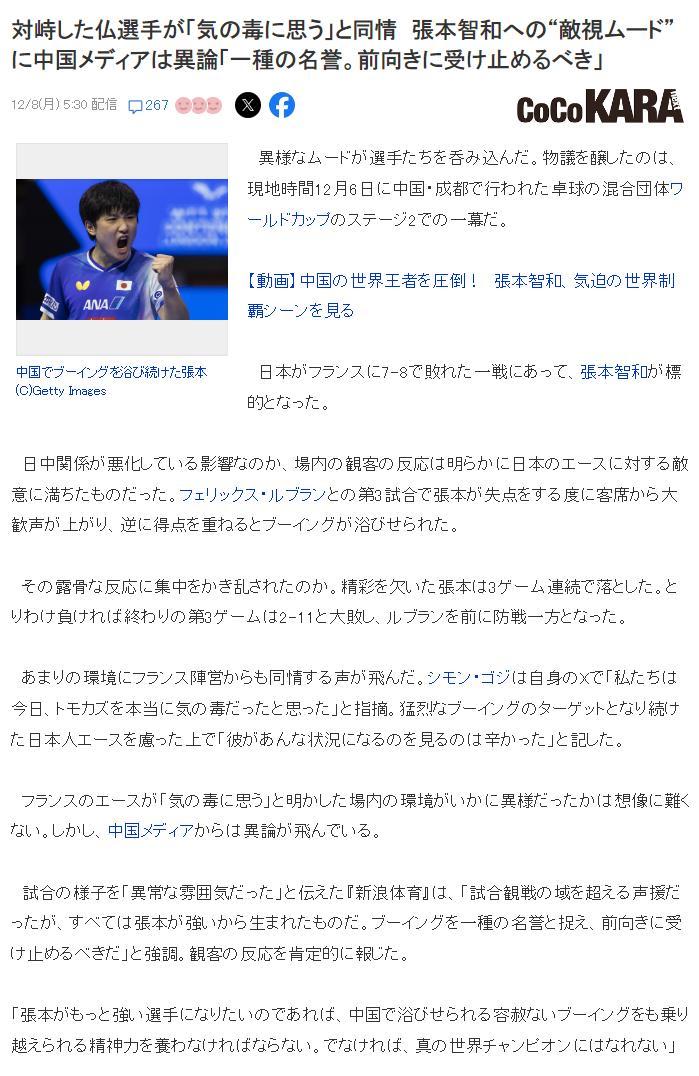 日本媒體《CoCoKARA》發聲爲張本智和鳴不平,他們認爲張本智和很可憐,他遭到了巨大的‘敵視情緒’,就連法國選手都覺得張本智和很可憐。
