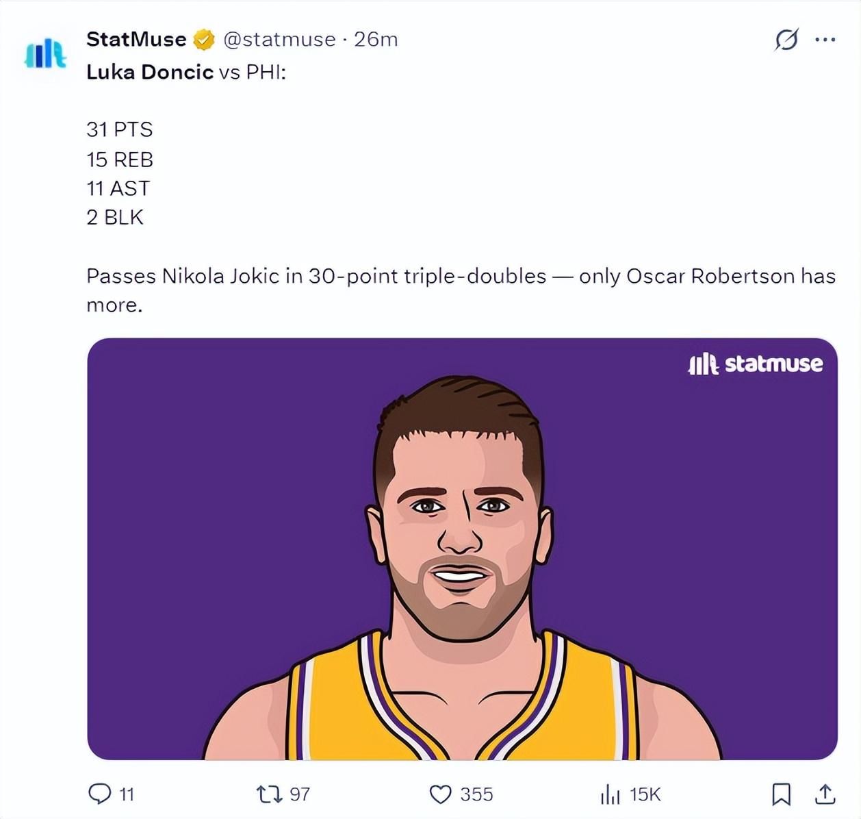 北京時間12月8日,湖人以112-108逆轉費城避免連敗,湖人也重返西部第二。東契奇無愧現役的天皇巨星,他回家兩場比賽復出就能打出完美的表演,他拿到31分15籃板11助攻的超級三雙數據,生涯第49次30+三雙超越約基奇、威少獨享歷史第二。