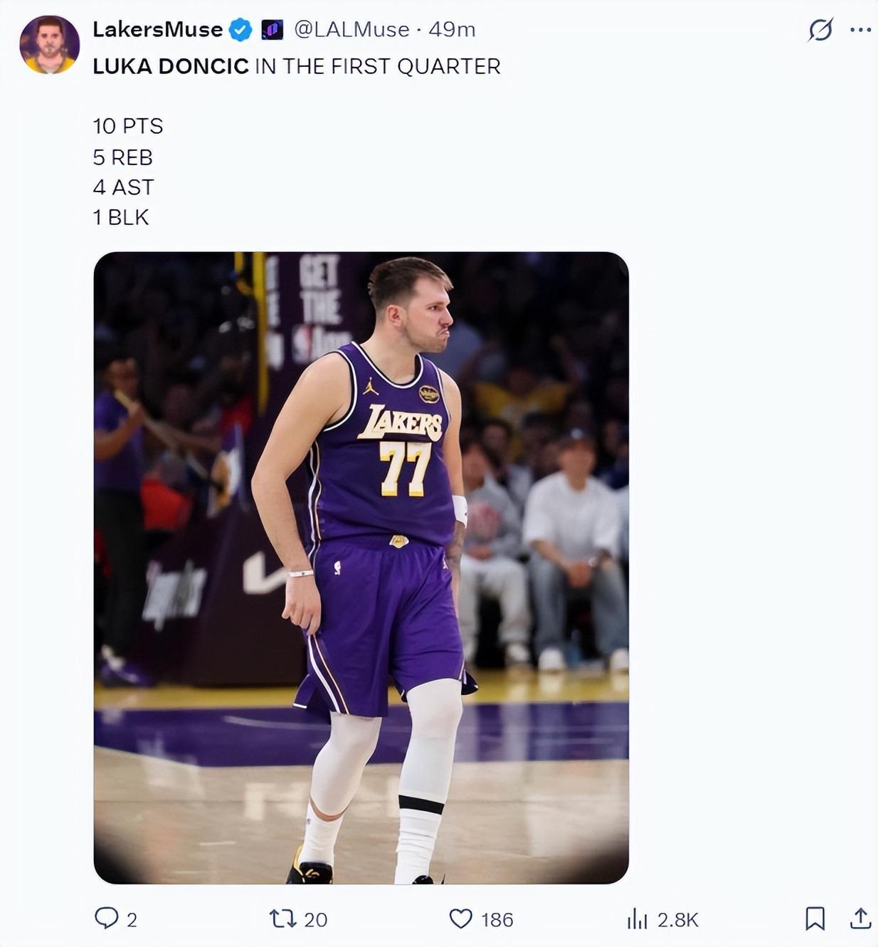 東契奇依舊是湖人先鋒官,裏夫斯此役是被埃奇庫姆給冰封了,首節東皇8中3+三分2中1+罰球4中3拿到10分5籃板4助攻1蓋帽,是他的努力才抹平了分差。