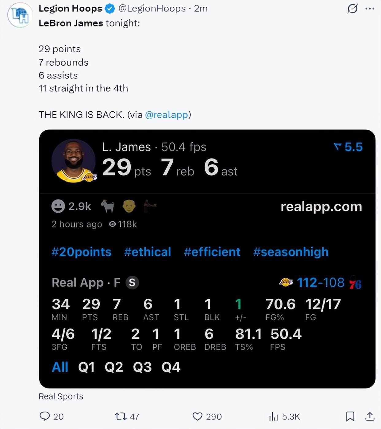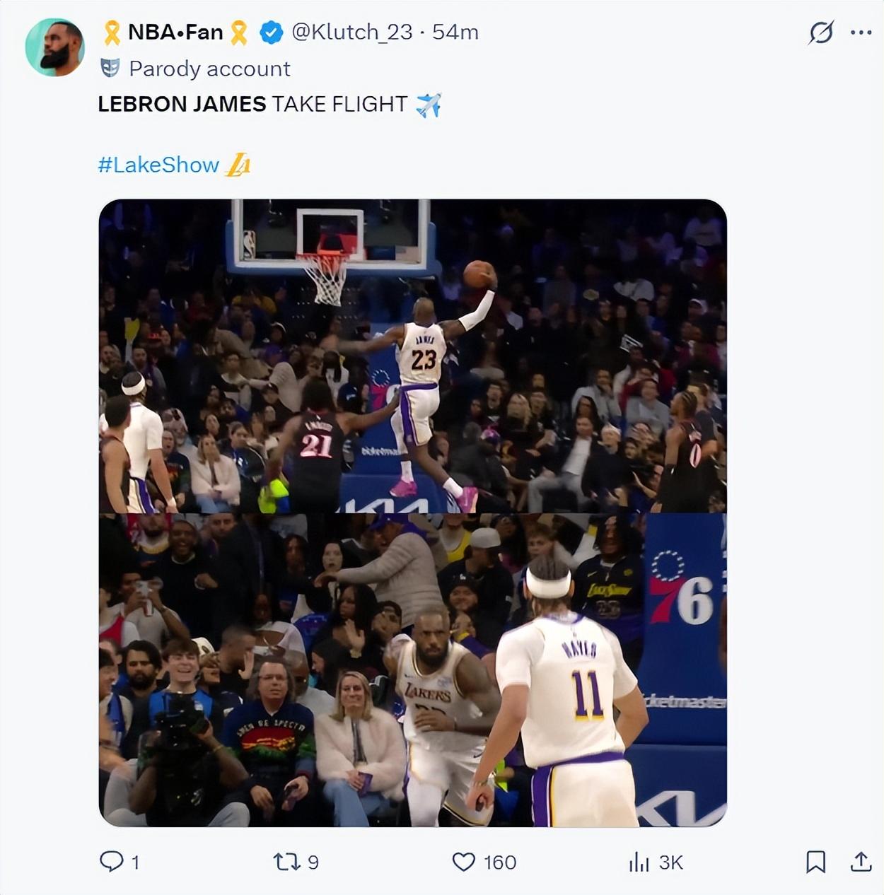 末節,老詹一切空切繼續得分,隨後助攻八村壘、文森特,老詹拿到19+6+6被換下休息。直到最後5分鐘才登場收割比賽,沒想到決勝時刻還真的全看詹姆斯,東契奇、裏夫斯連續打鐵,詹姆斯連拿7分打停費城,4.2秒費城暫停,暫停後詹姆斯搶斷絕殺,詹姆斯末節12分3籃板3助攻1搶斷(6中5+三分2中2)。