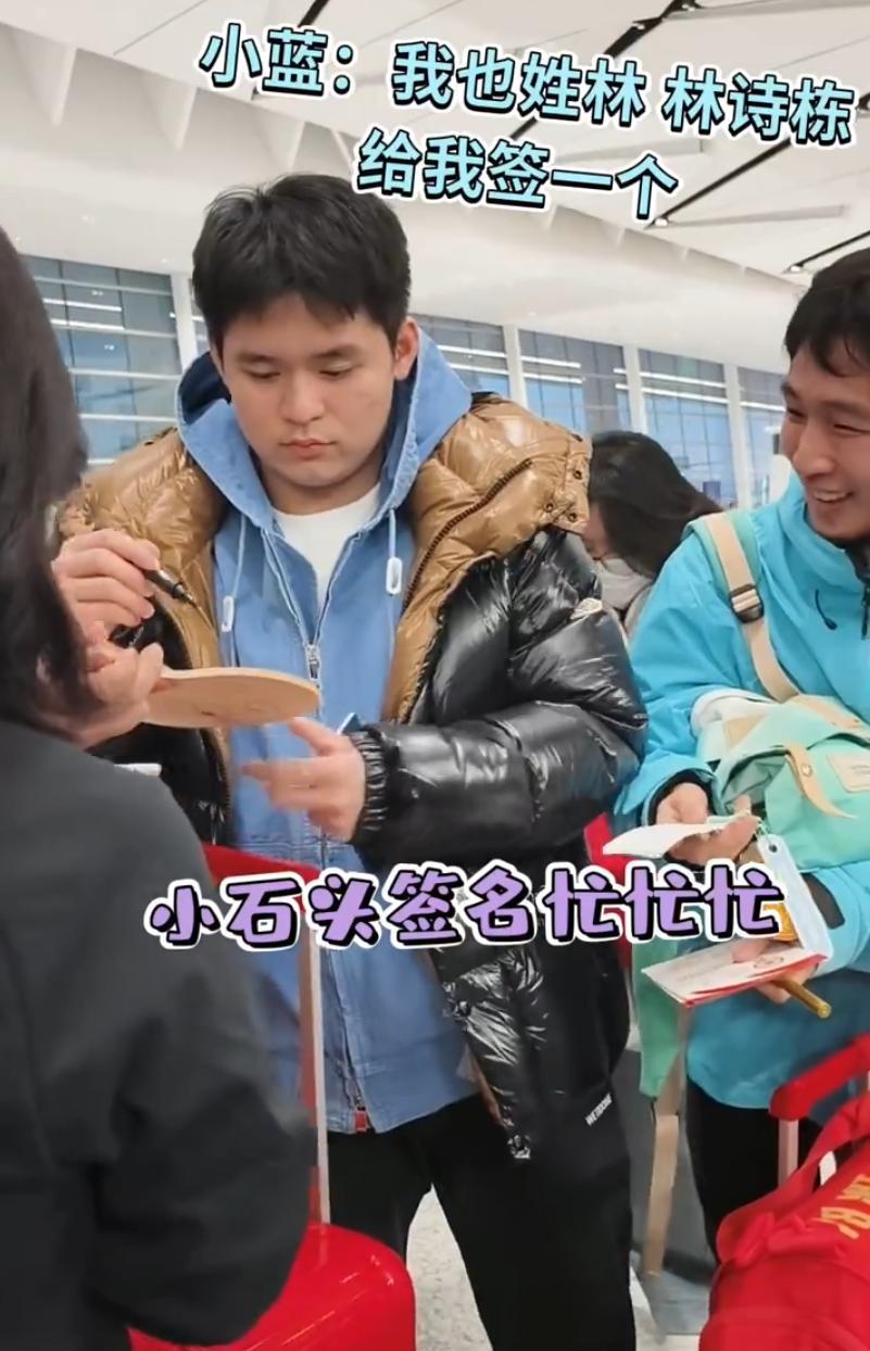 小石頭在機場遇到了很多的球迷,林詩棟對球迷們索要簽名的要求一一應答,他穿着超厚的羽絨服在機場簽名,小石頭本次決賽2-1擊敗張本智和完成了復仇。