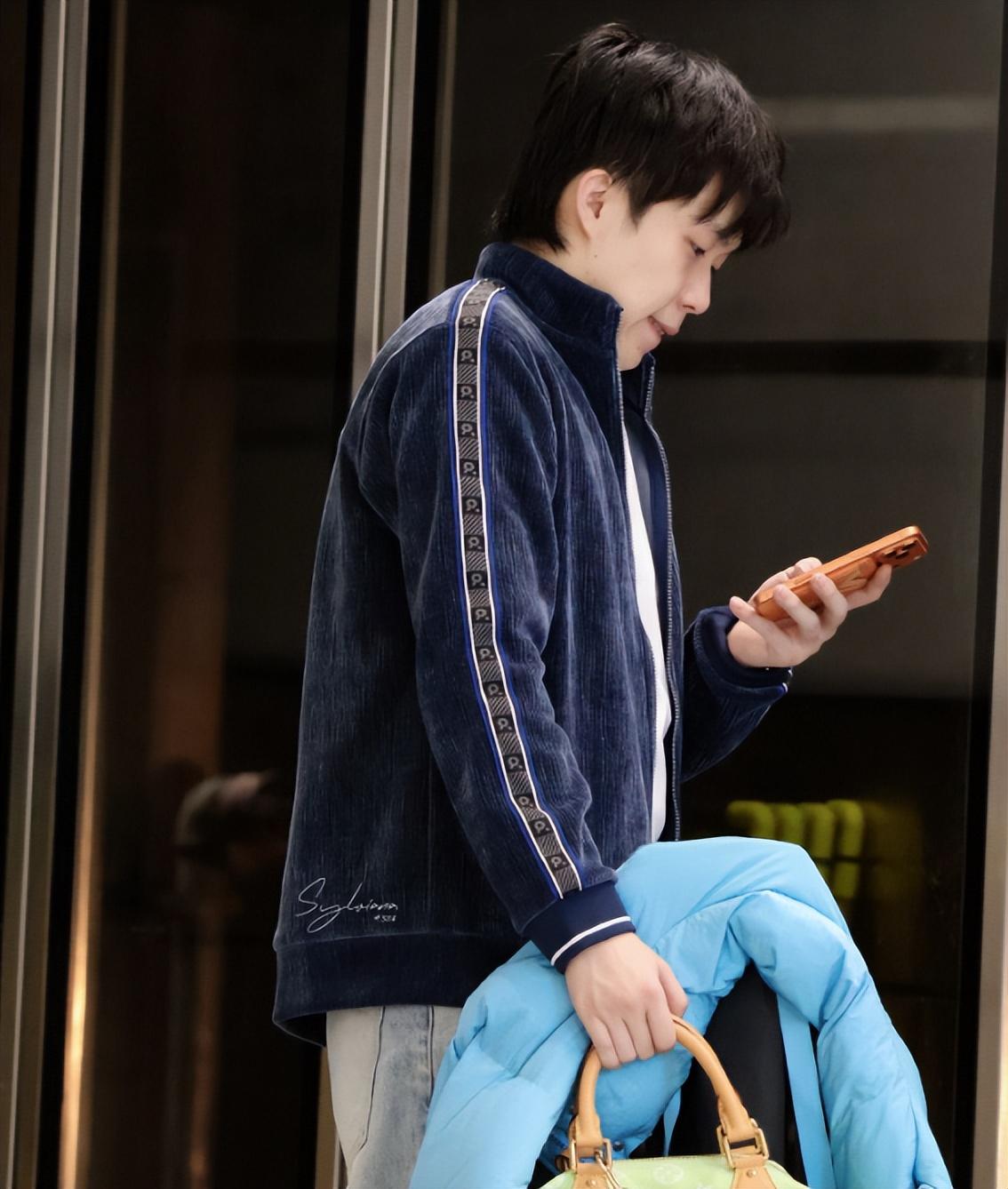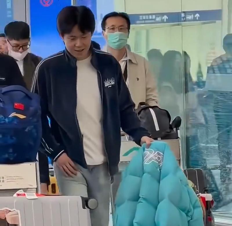 王楚欽也是剛剛下飛機就脫掉了他淡藍色的羽絨服外套,他還穿了一個深藍色的夾克與一件白色的T恤,他與一行人有說有笑。