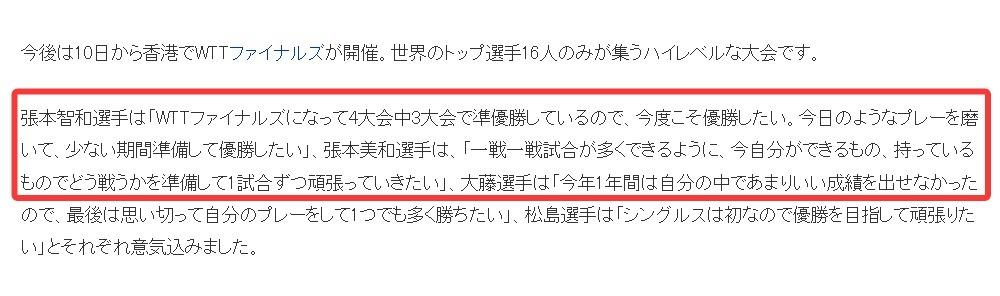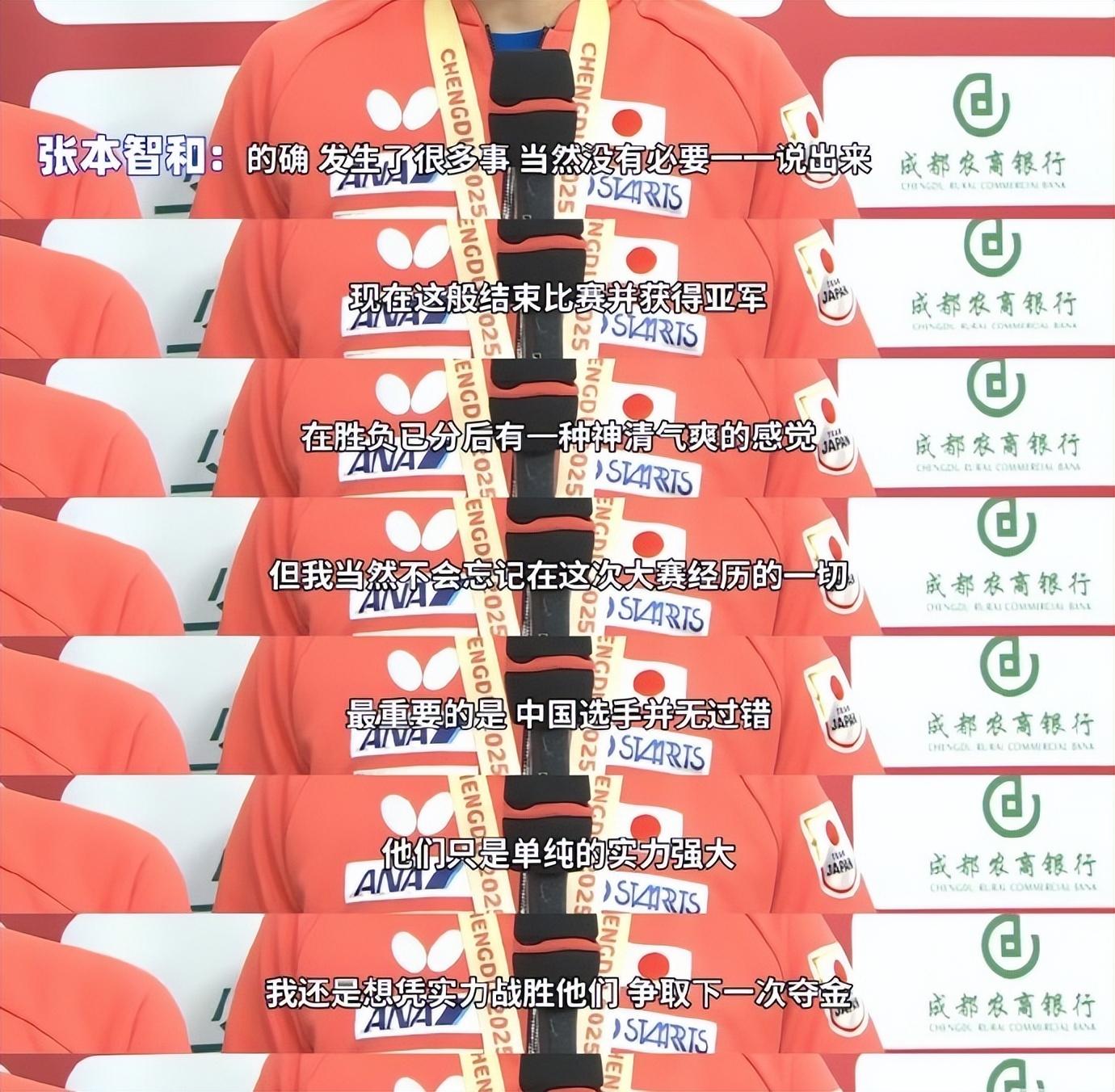 不過在頒獎典禮後張本智和還是道出一番苦水,他說比賽結束有一種神清氣爽的感覺,不會忘記本次大賽的一切經歷,中國選手沒有過錯他們只是單純的實力強大,還是希望下一次自己憑實力戰勝他們奪冠。