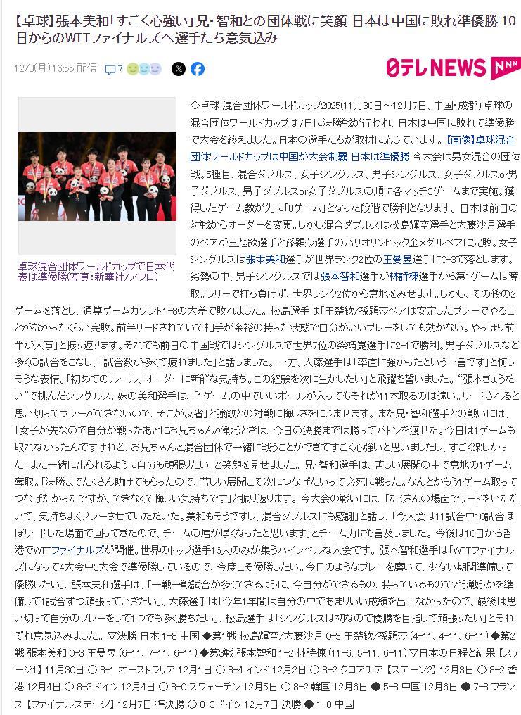 張本美和在接受日媒採訪時也談到了接下來12月10日-14日在香港舉辦的WTT總決賽,她說道:自己就是準備好打每一場比賽,能多打一場是一場,我想自己能做的就是控制自己的表現更加穩定,爲下一場比賽做好準備。(再度遇上王曼昱,可不是能打一場是一場嗎?)