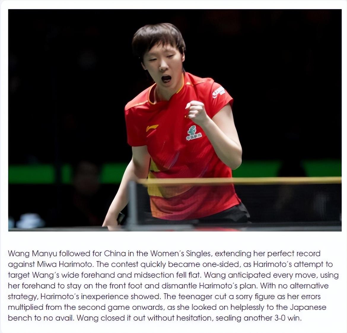 ITTF在官網的文章中就扎心了張本美和:王曼昱在混團世界盃決賽的第二盤中出戰,並延續了她對陣張本美和的完美戰績。王曼昱毫不猶豫地鎖定勝局,再次以3-0的比分獲勝。
