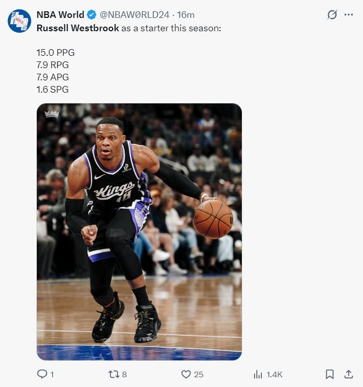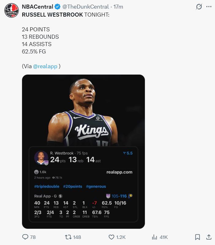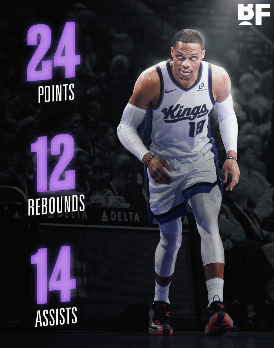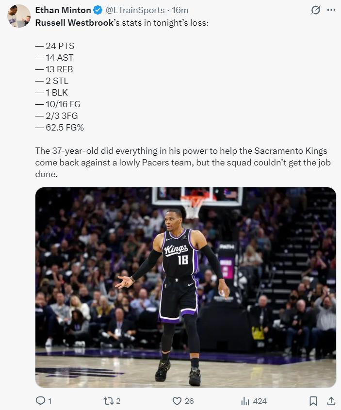 國王記者曬出威少的數據致謝道:這位 37 歲的老將竭盡全力幫助薩克拉門託國王隊。
