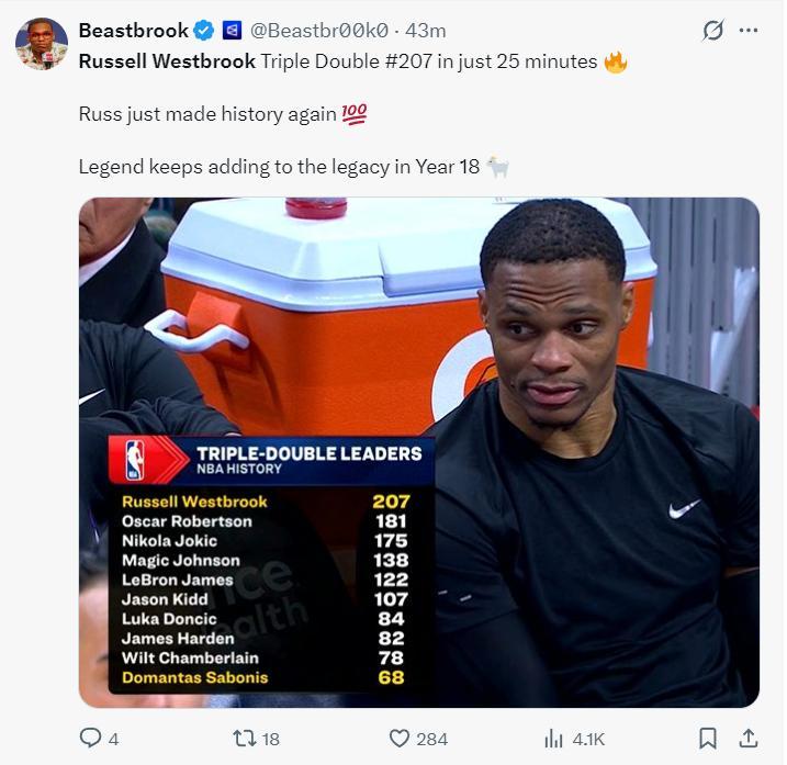 3.這是威少第135次砍下20+三雙,反超約基奇登頂20+三雙歷史榜首;