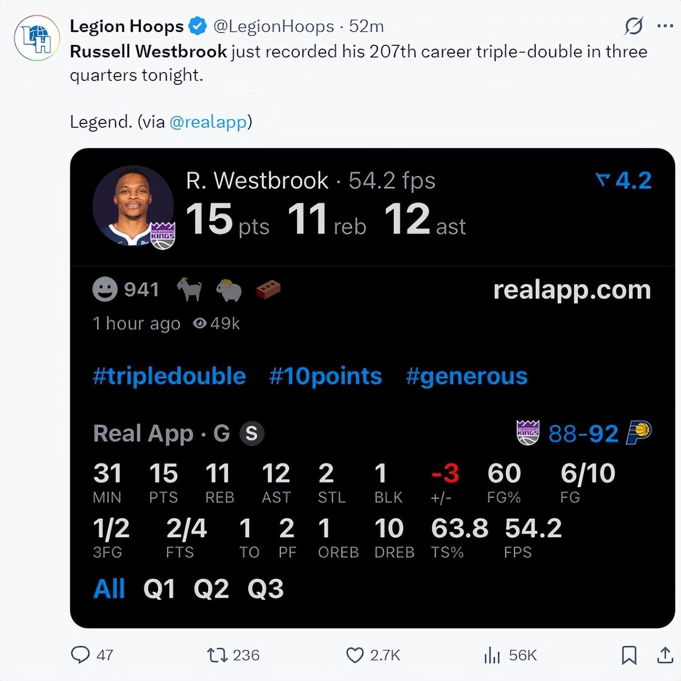 國王隊官方也曬出推文祝賀拉塞爾-威斯布魯克完成自己新的生涯里程碑。