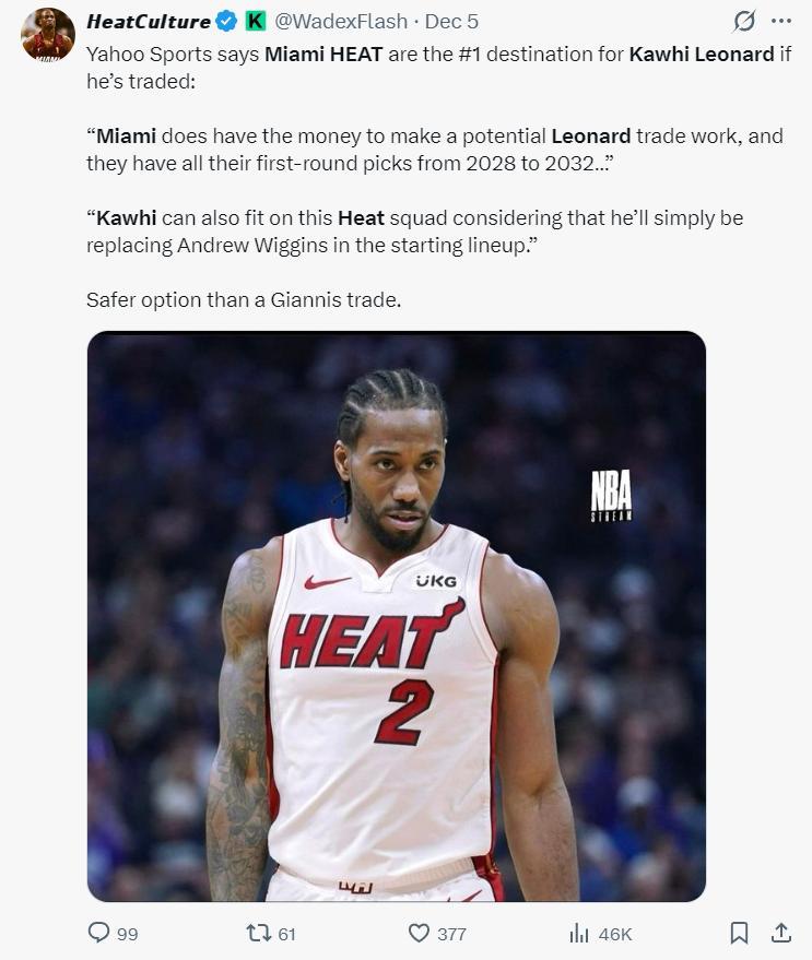 實際上在12月5日,《雅虎體育》就分析過,如果科懷-萊昂納德要被交易,那麼熱火隊會是他的首選地,邁阿密有足夠的薪金空間來促成交易,並且他們有2028-2032年的首輪選秀權,小卡來到這裏也只需要頂替威金斯的位置,他可以輕鬆完成這項工作,熱火交易得到小卡比交易得到揚尼斯要穩妥的多。