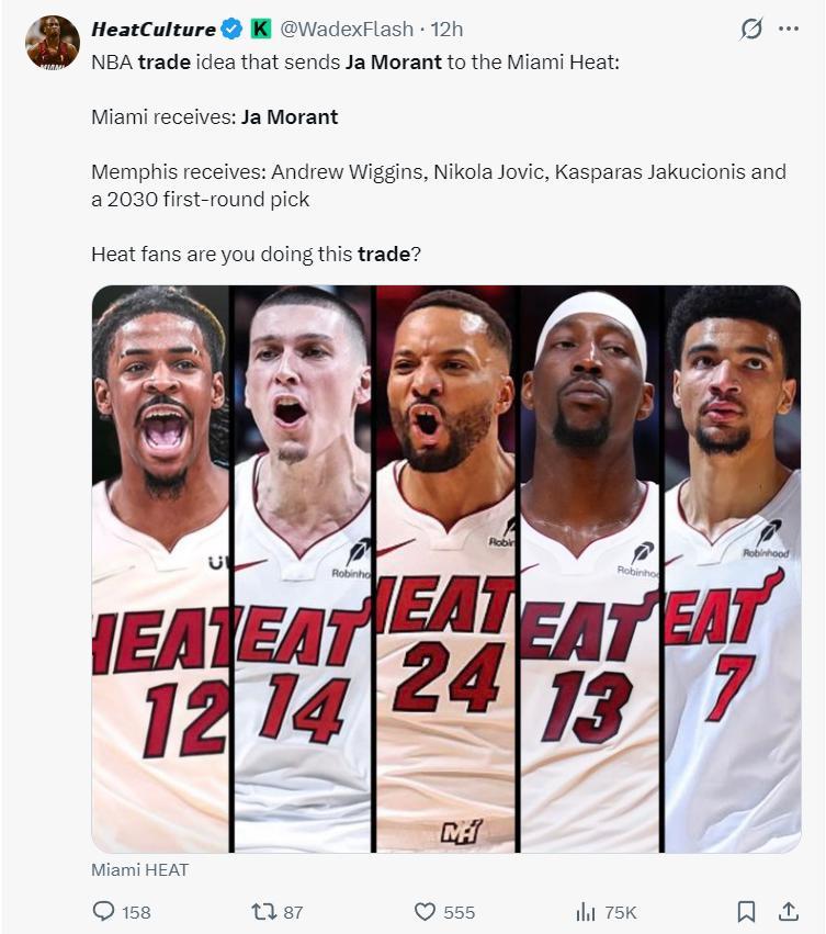 實際上熱火是有能力同時得到莫蘭特與小卡的,熱火媒體模擬了一套交易得到莫蘭特的方案,送出安德魯-威金斯、尼古拉-約維奇、亞庫契奧尼斯、2030年首輪籤,也就是4換1得到莫蘭特,這筆交易沒動鮑威爾、羅齊爾。