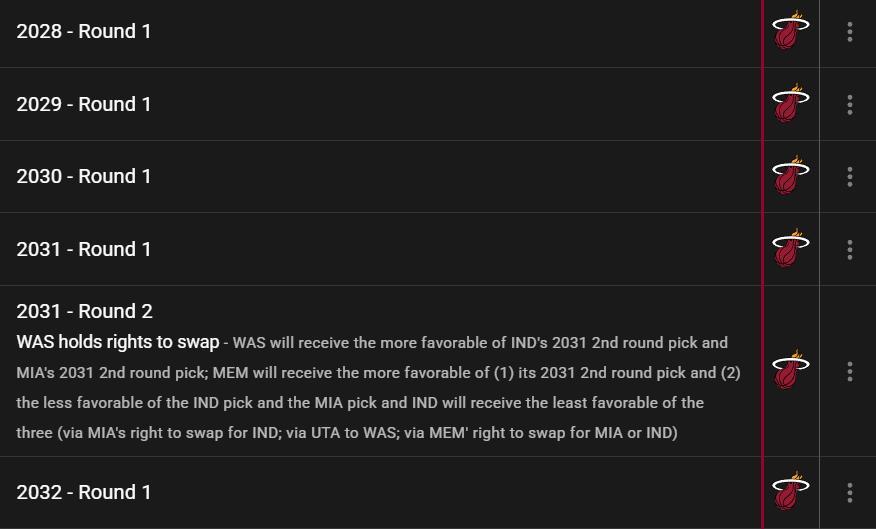大家可能發現了,這兩筆交易模擬都出了2030年首輪籤,肯定是無法同時送2030年首輪籤的,可實際上熱火有2028/2029/2030/2031/2032五個首輪籤,所以熱火可以從2029年、2031年兩個首輪籤,因爲兩個模擬中都只出了一個首輪籤,所以理論上是可以同時交易得到莫蘭特+萊昂納德的。