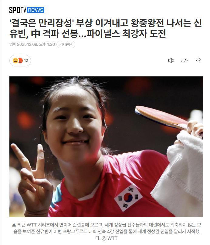 北京時間12月9日,根據韓國媒體《spotvnews》的報道,申裕斌將帶着膝傷出戰WTT香港總決賽,申裕斌想要衝擊更高的世界排名與創造更多的紀錄。