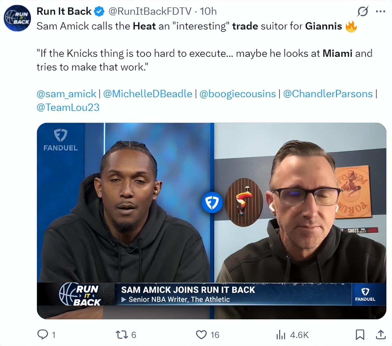 薩姆-阿米克在播客節目中談到,熱火是針對揚尼斯-阿德託昆博頗具吸引力的求購對象,如果尼克斯未能追逐揚尼斯成功,大家可以看看邁阿密的做法。