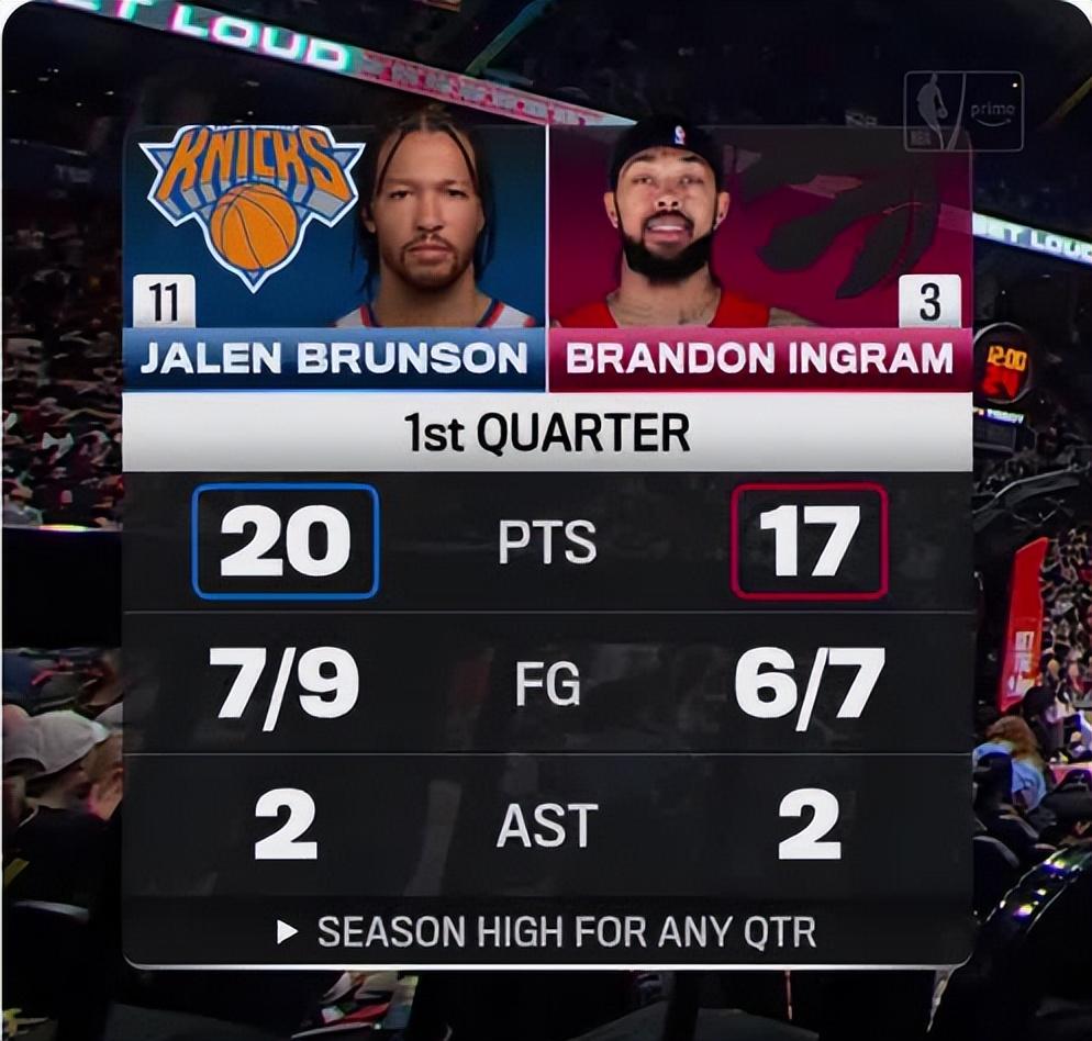 首節開場兩隊的核心人物對轟,兩人都打滿12分鐘,布倫森9中7+6中4拿到20分2助攻,英格拉姆7中6+三分1中1拿到17分3籃板2助攻2搶斷,英格拉姆在最後1分鐘幫助猛龍領先結束首節。