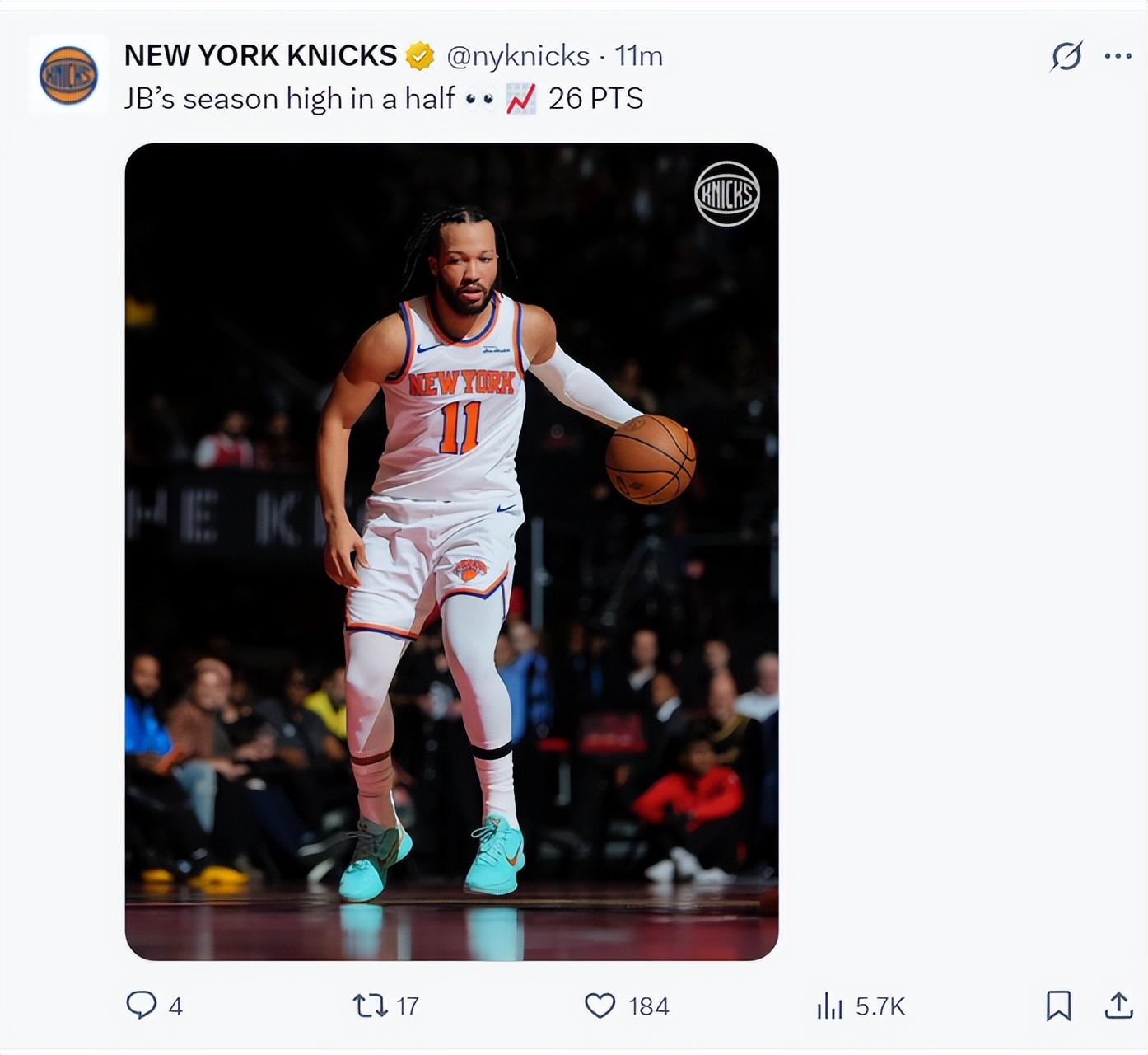全場比賽,布倫森完成尼克斯隊史第87次30+並列第三,18中13,三分9中6,拿到35分4助攻2籃板1蓋帽,命中率72.2%,三分命中率66.7%。