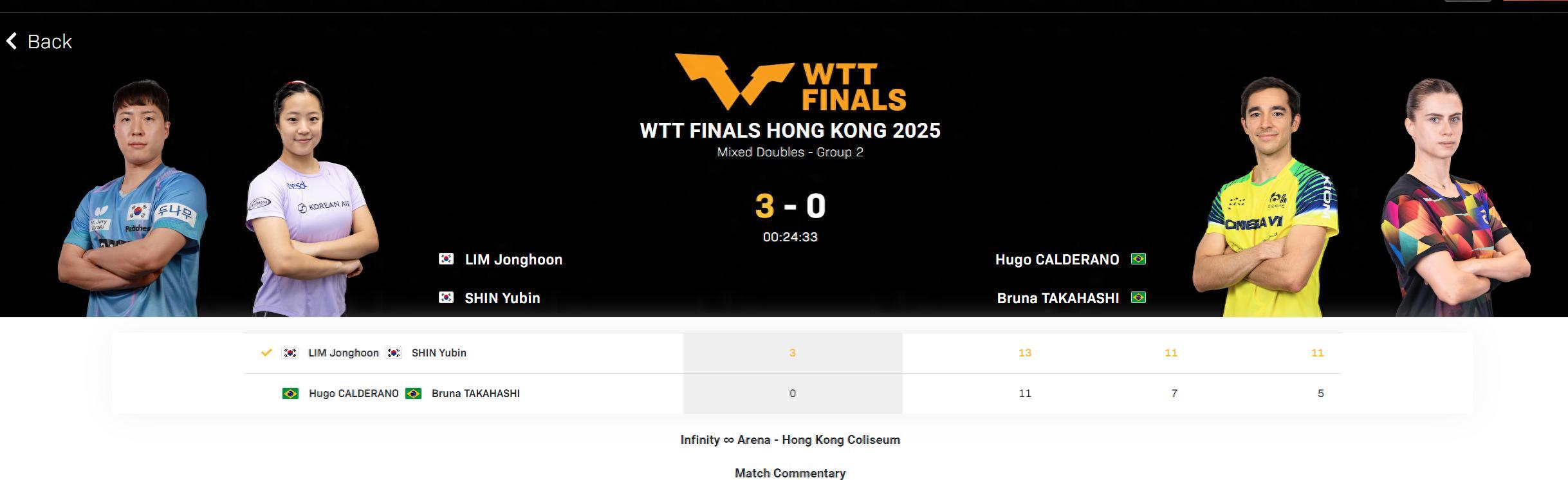 雖然申裕斌的敏捷性下滑可她與林鐘勳的默契還在,兩人開場是4-2領先,隨後雨果/布魯娜5-4反超,雨果/布魯娜一度9-7領先,但申裕斌正手拿分,雨果失誤9-9、10-10、11-11,關鍵分還是韓乒組合拿下13-11完成逆轉。