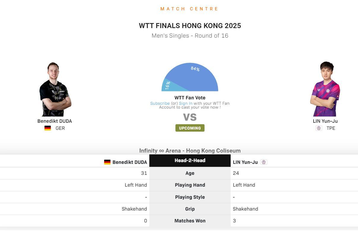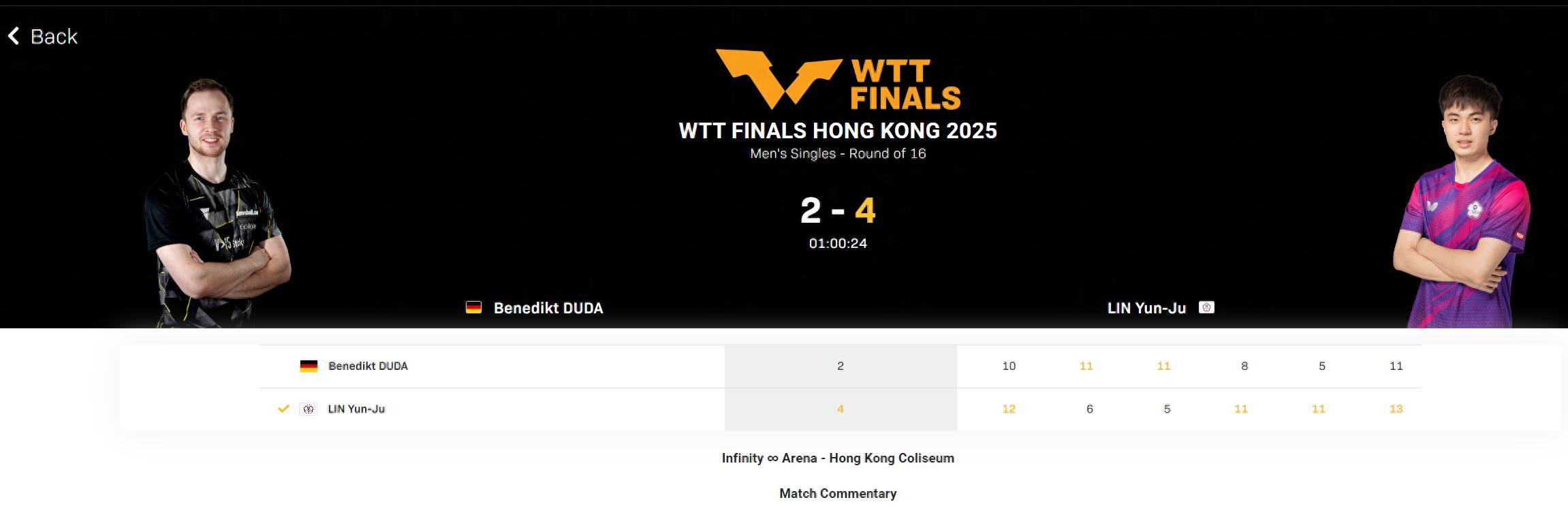北京時間12月10日,WTT香港總決賽男單1/8決賽,林昀儒4-2擊敗杜達晉級八強,六局比分:12-10,6-11,5-11,11-8,11-5,13-11。林昀儒生涯面對杜達已經豪取四連勝,杜達一度2-1領先隨後是連丟三局被淘汰。