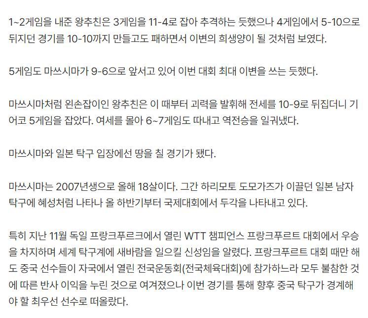 文中寫道:這場比賽開場時你們會發現不知道誰纔是世界第一,王楚欽作爲世乒賽新科冠軍被18歲的日乒超星壓着打,第四局王楚欽5-10落後追到10-10還是落敗,第五局松島輝空一度9-6領先,那一刻所有人都覺得世界第一要輸球了。