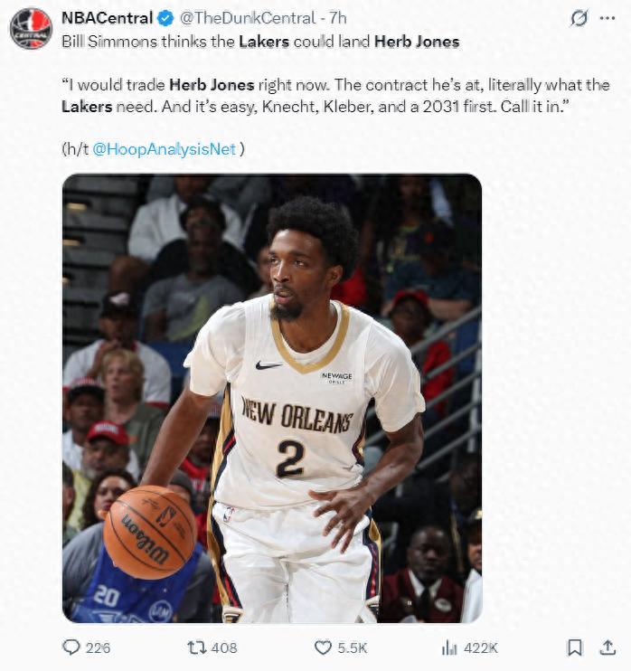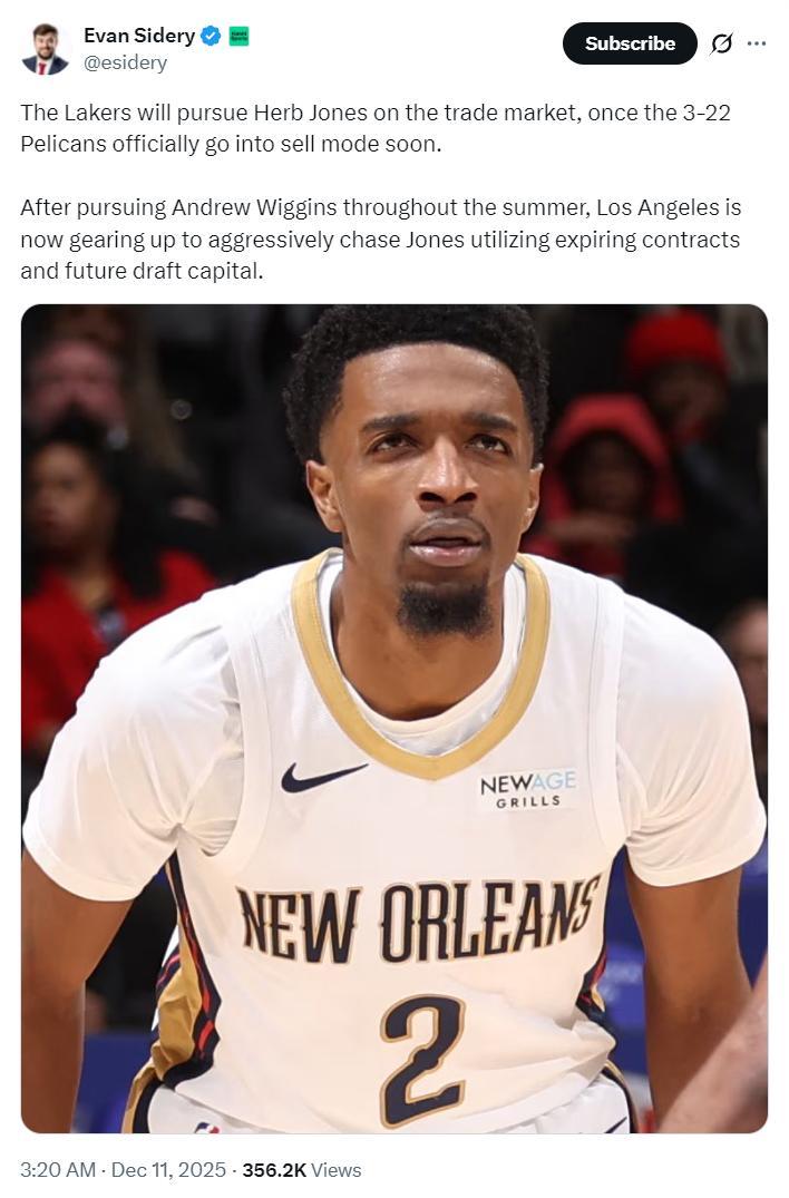 NBA記者埃文-斯迪瑞這樣寫道:一旦戰績3勝22負的鵜鶘隊進入兜售模式,湖人隊會在交易市場上猛烈追求赫伯特-瓊斯。湖人整個休賽期都在關注安德魯-威金斯,但如今他們已經將矛頭轉向了赫伯特-瓊斯。